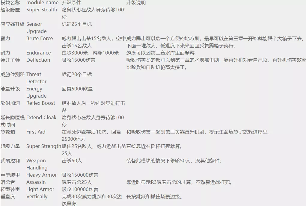 【最大强度】 仅使用纳米服的增强功能而非枪支杀死25个敌人。 我发现最简单的方法是:四处搜寻敌人,使用隐形衣进入隐形状态,靠近他们后进行近战攻击……这是个很简单的成就。
