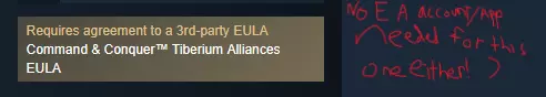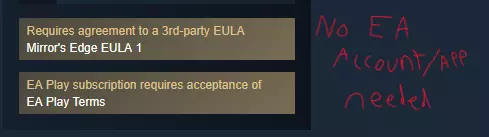 这展示了不需要EA应用程序/账户的游戏在商店页面的显示情况。以下是两个不需要EA应用程序/账户的游戏示例。注意它们的商店页面中没有【包含第三方DRM:需要EA在线激活以及EA应用程序的安装和后台运行】和【需要第三方账户:EA账户】这样的内容。这些示例游戏是《镜之边缘》和《命令与征服:泰伯利亚联盟》。