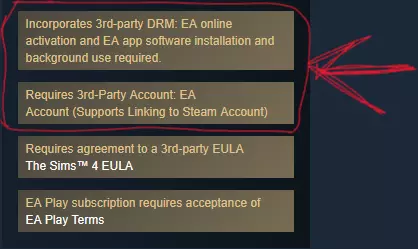 本指南旨在帮助你在购买EA游戏前了解所需信息。 你需要注意的事项: 在每个商店页面的右侧,有一些青铜色的方框区域,其中包含有用信息。 具体来说,我们要查找的是写有【包含第三方DRM:需要EA在线激活以及EA应用程序的安装和后台运行】和【需要第三方账户:EA账户】的内容。 这些示例展示了《模拟人生4》和《星球大战 绝地:陨落的武士团™》的相关情况。