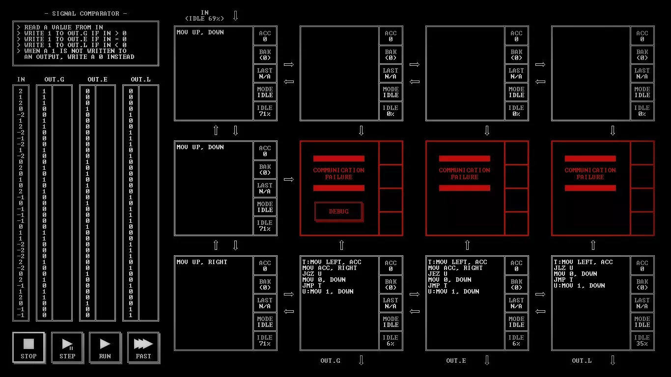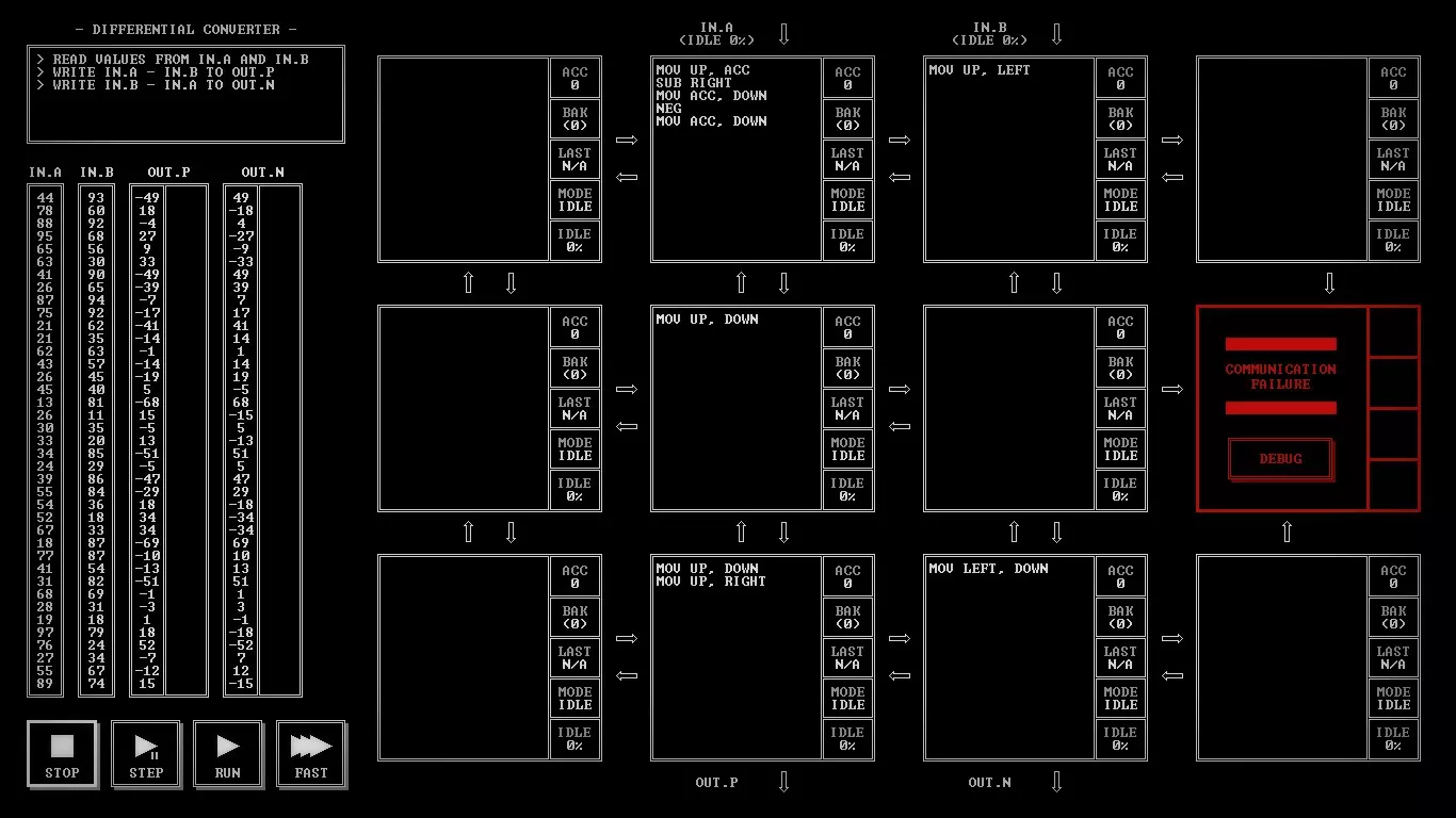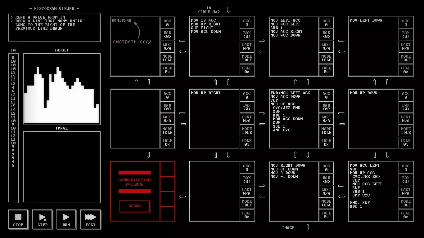 给想在Steam上开始学习编程的人 《TIS-100》评测 因为《极品飞车:宿敌》的评测还在制作中,而又想给大家带来点什么,所以我决定讲讲一款名为《TIS-100》的游戏。这是一款很棒的游戏,它是一个80年代设备的汇编语言编程模拟器。听起来可能有点枯燥,对吧?我同意。不过它比你想象的要有趣那么一点点。我们需要重写TIS-100的代码片段,以修复设备并了解其所有秘密。 那么什么是TIS-100呢?Tessellated Intelligence System第100型号,是一个为你工作的具有12个核心的古老计算系统模拟器。意思是,完全不明白?如果再读一遍呢?嗯……好吧,我简单解释一下。你需要编写一个小程序来解决特定的任务。例如,将给定的数字翻倍,或者交换两个未知数的值并继续传递。任务的难度会逐渐增加,但你不会遇到非常复杂的内容。最初的关卡会认真教你游戏的基础知识,慢慢提高任务的初始难度。 游戏中甚至有其独特的氛围。启动游戏的过程非常像启动一个工作用的程序模拟器。风扇嗡嗡作响,游戏的一半内容采用黑白风格呈现。整体看起来既有趣又充满神秘感。游戏中有许多独特且富有特色的音效,这些音效有助于玩家更好地沉浸其中。这款游戏难度极高,甚至很难将其单纯称为游戏。它更像是一款使用虚构汇编语言来教授人们编程的应用程序。或许它并非那么光鲜有趣,但却非常实用且引人入胜。为了获得舒适的游戏体验,我们需要打印游戏手册。这是一本操作说明书。官方虽然不支持俄语,但你可以在Steam社区指南中找到翻译版本。里面包含了游戏的所有必要信息、TIS-100的工作特性以及所需的指令列表。说到指令,有一些比较常见的操作数,比如LEFT、RIGHT、DOWN、UP、ACC等。指令列表不算长,包括Nop、mov、add等,总共大约有一二十个。什么?还是完全不明白……嗯……好吧。简单来说,我们有12个核心并行工作,一个主寄存器和一个备用寄存器,以及最必要的指令。就是这样。虽然指令集不大,但非常适合入门学习。 总而言之,可以说《TIS-100》对于想要开始学习编程的人来说是个不错的起点。游戏提供的任务难度不超过《传送门2》的水平。所有这些任务都巧妙地隐藏在富有氛围感的编程界面之下。这款游戏很有趣,能让人动动脑筋,这点很让人满意。产品价格相当合理,绝对不会让你破费。如果你喜欢编程,那么《TIS-100》你肯定会喜欢。它氛围十足、趣味盎然、引人入胜。这就是《TIS-100》。谢谢大家看到最后。祝大家度过愉快的一天! 截图