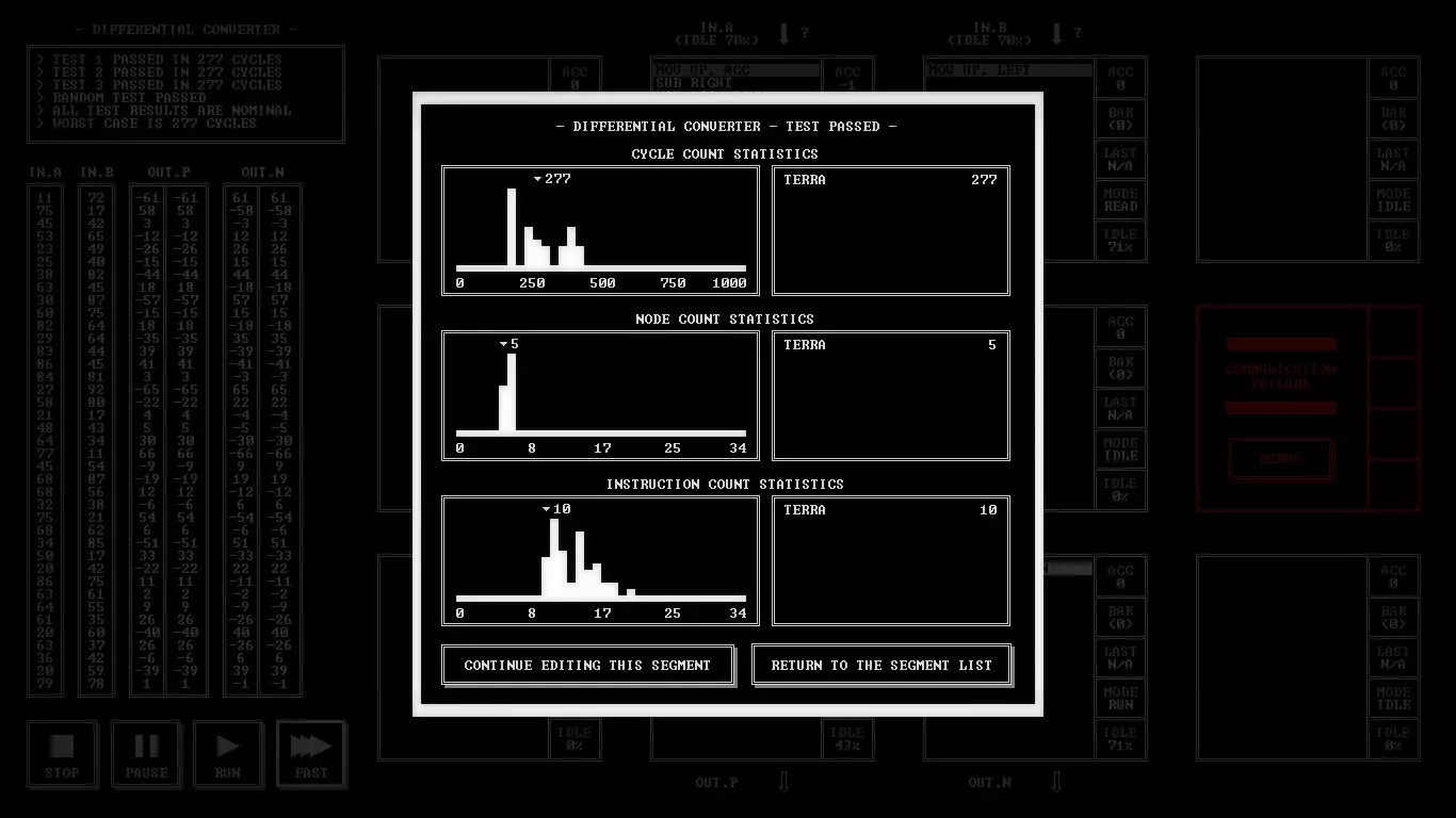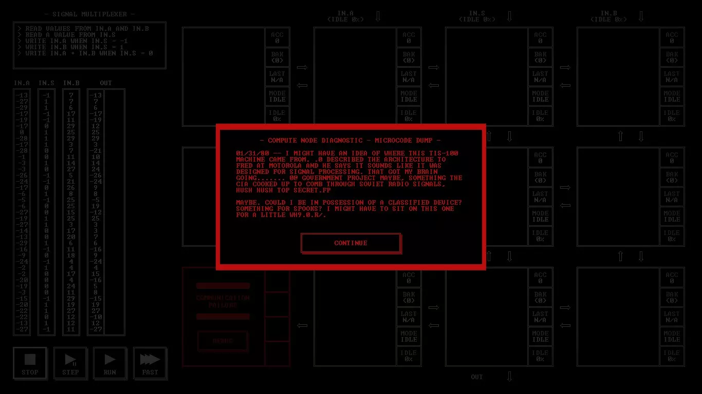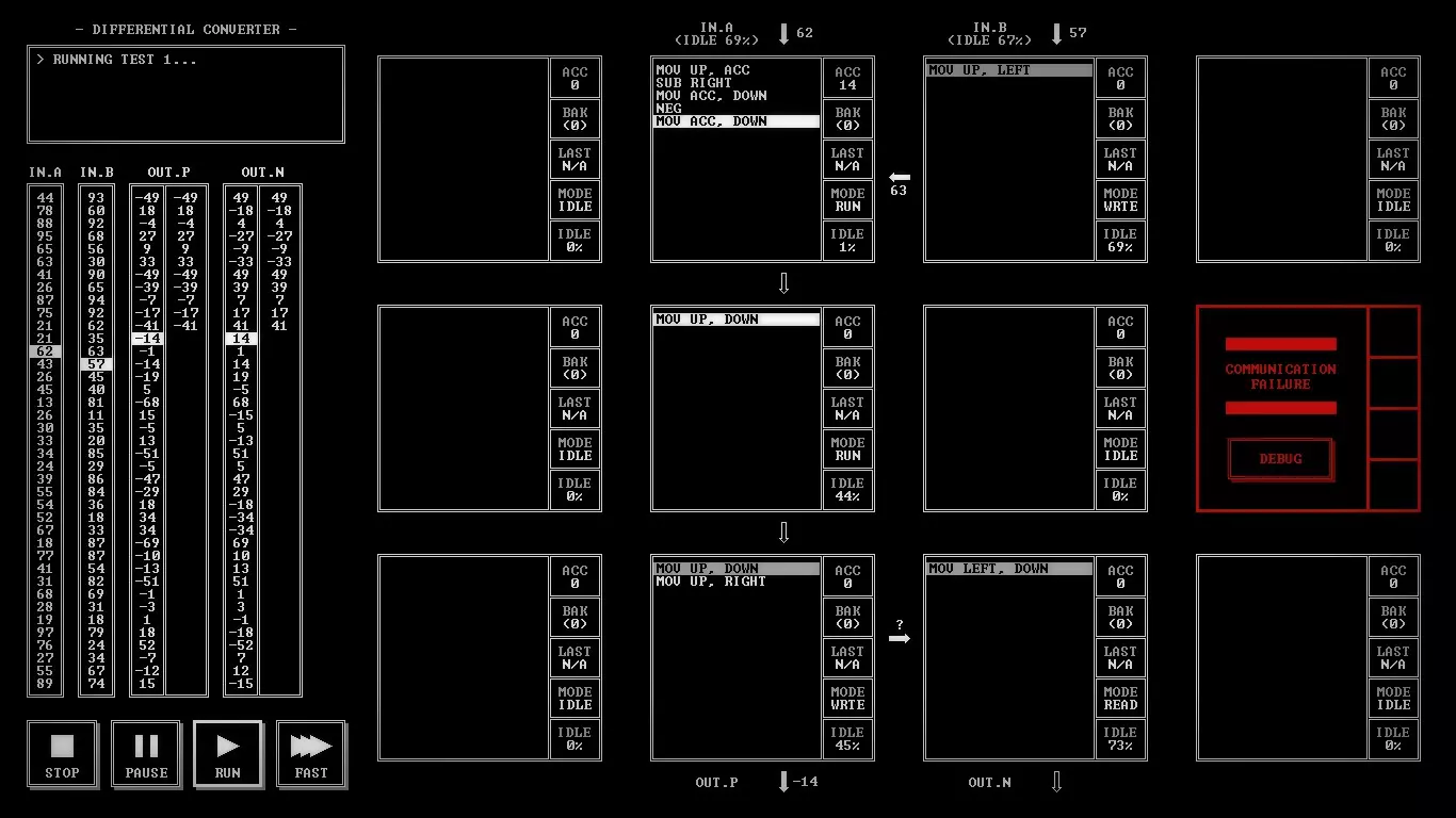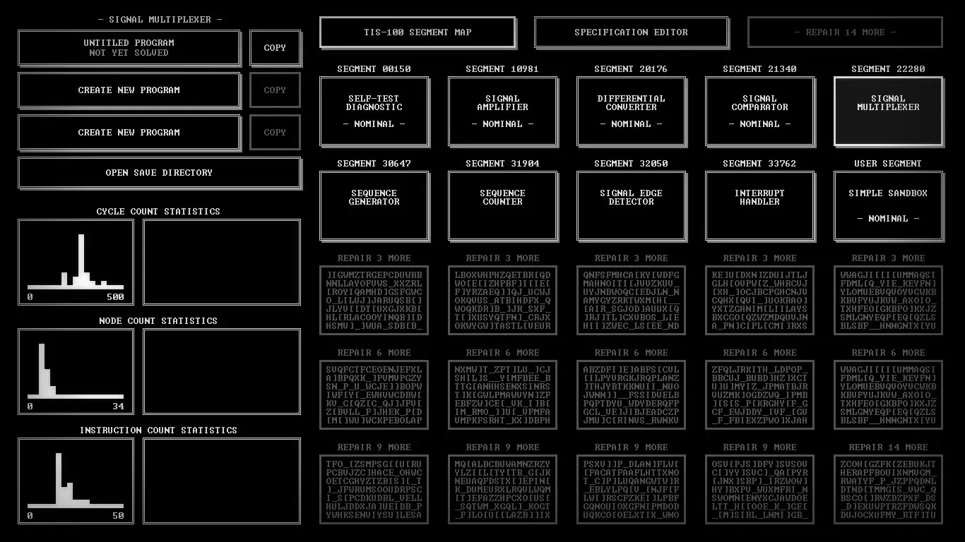 给想在Steam上开始学习编程的人 《TIS-100》评测 因为《极品飞车:宿敌》的评测还在制作中,而又想给大家带来点什么,所以我决定讲讲一款名为《TIS-100》的游戏。这是一款很棒的游戏,它是一个80年代设备的汇编语言编程模拟器。听起来可能有点枯燥,对吧?我同意。不过它比你想象的要有趣那么一点点。我们需要重写TIS-100的代码片段,以修复设备并了解其所有秘密。 那么什么是TIS-100呢?Tessellated Intelligence System第100型号,是一个为你工作的具有12个核心的古老计算系统模拟器。意思是,完全不明白?如果再读一遍呢?嗯……好吧,我简单解释一下。你需要编写一个小程序来解决特定的任务。例如,将给定的数字翻倍,或者交换两个未知数的值并继续传递。任务的难度会逐渐增加,但你不会遇到非常复杂的内容。最初的关卡会认真教你游戏的基础知识,慢慢提高任务的初始难度。 游戏中甚至有其独特的氛围。启动游戏的过程非常像启动一个工作用的程序模拟器。风扇嗡嗡作响,游戏的一半内容采用黑白风格呈现。整体看起来既有趣又充满神秘感。游戏中有许多独特且富有特色的音效,这些音效有助于玩家更好地沉浸其中。这款游戏难度极高,甚至很难将其单纯称为游戏。它更像是一款使用虚构汇编语言来教授人们编程的应用程序。或许它并非那么光鲜有趣,但却非常实用且引人入胜。为了获得舒适的游戏体验,我们需要打印游戏手册。这是一本操作说明书。官方虽然不支持俄语,但你可以在Steam社区指南中找到翻译版本。里面包含了游戏的所有必要信息、TIS-100的工作特性以及所需的指令列表。说到指令,有一些比较常见的操作数,比如LEFT、RIGHT、DOWN、UP、ACC等。指令列表不算长,包括Nop、mov、add等,总共大约有一二十个。什么?还是完全不明白……嗯……好吧。简单来说,我们有12个核心并行工作,一个主寄存器和一个备用寄存器,以及最必要的指令。就是这样。虽然指令集不大,但非常适合入门学习。 总而言之,可以说《TIS-100》对于想要开始学习编程的人来说是个不错的起点。游戏提供的任务难度不超过《传送门2》的水平。所有这些任务都巧妙地隐藏在富有氛围感的编程界面之下。这款游戏很有趣,能让人动动脑筋,这点很让人满意。产品价格相当合理,绝对不会让你破费。如果你喜欢编程,那么《TIS-100》你肯定会喜欢。它氛围十足、趣味盎然、引人入胜。这就是《TIS-100》。谢谢大家看到最后。祝大家度过愉快的一天! 截图