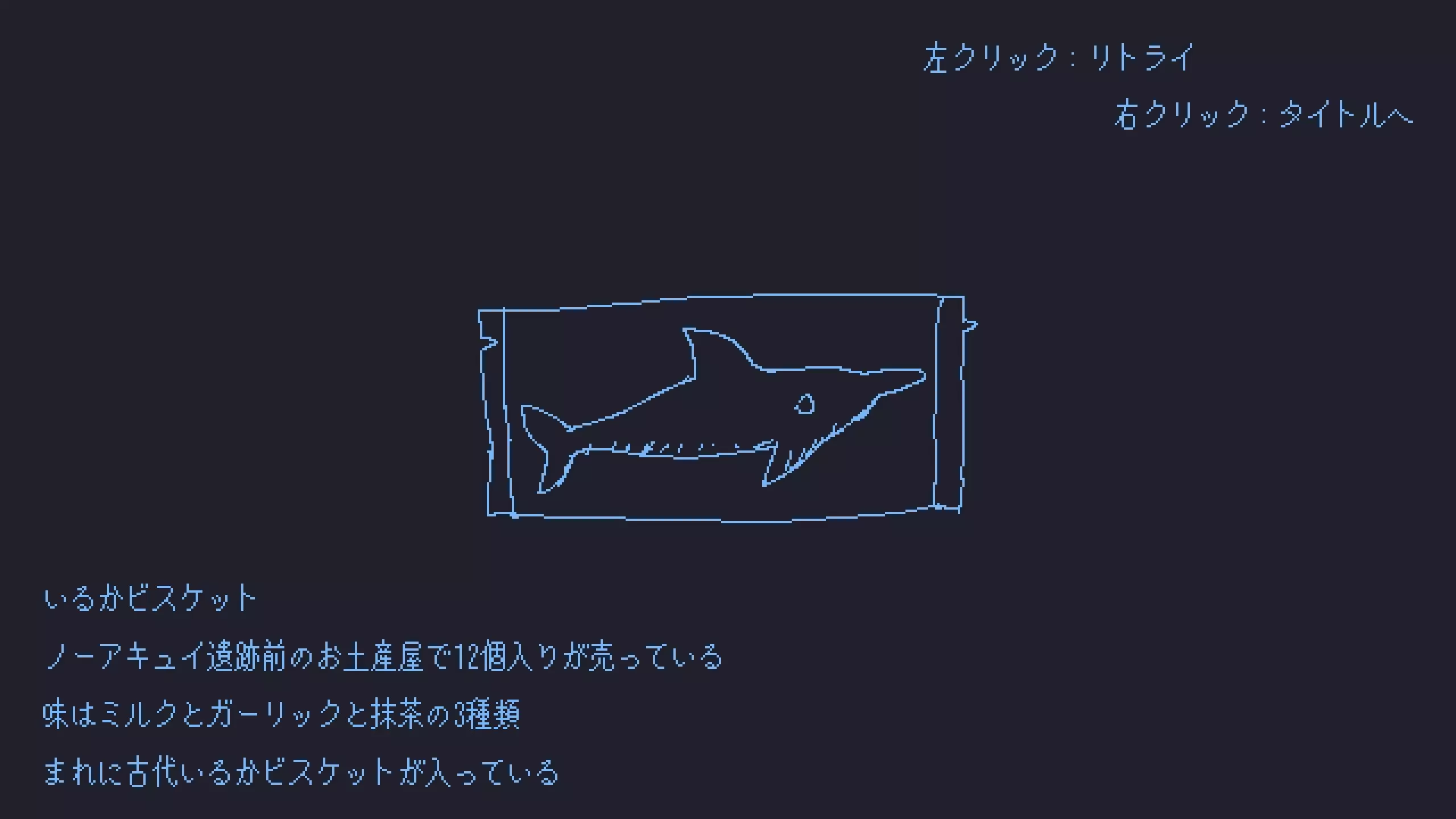 海豚饼干 在诺亚·库伊亚遗迹前的纪念品商店出售,一盒12个。 有三种口味:牛奶、大蒜与抹茶。 偶尔会混入一枚【古代海豚饼干】。