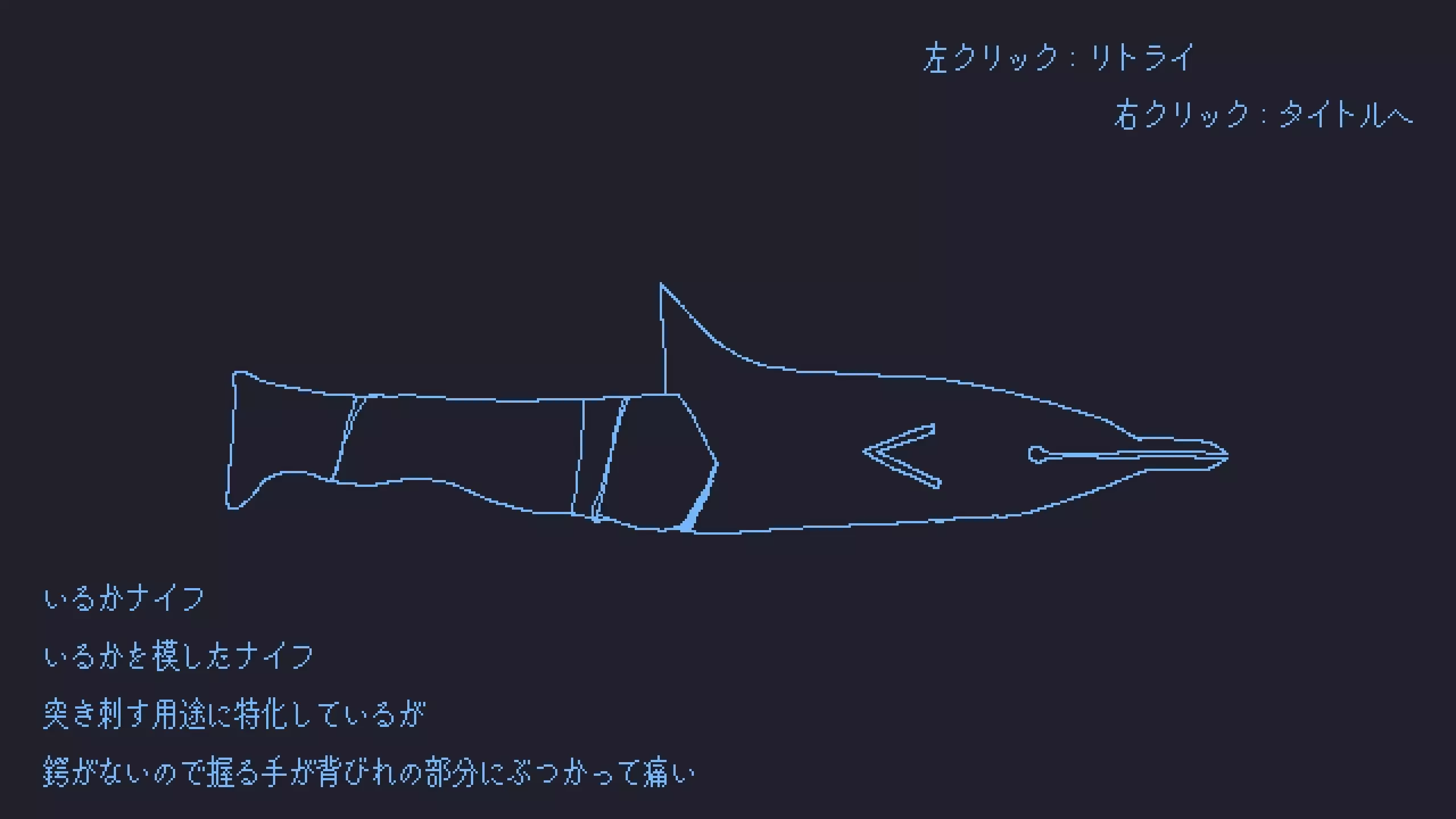 海豚小刀 形状为海豚的小刀。 专为刺击而设计,但因缺乏护手, 持刀者的手经常会撞上背鳍部分,导致疼痛。