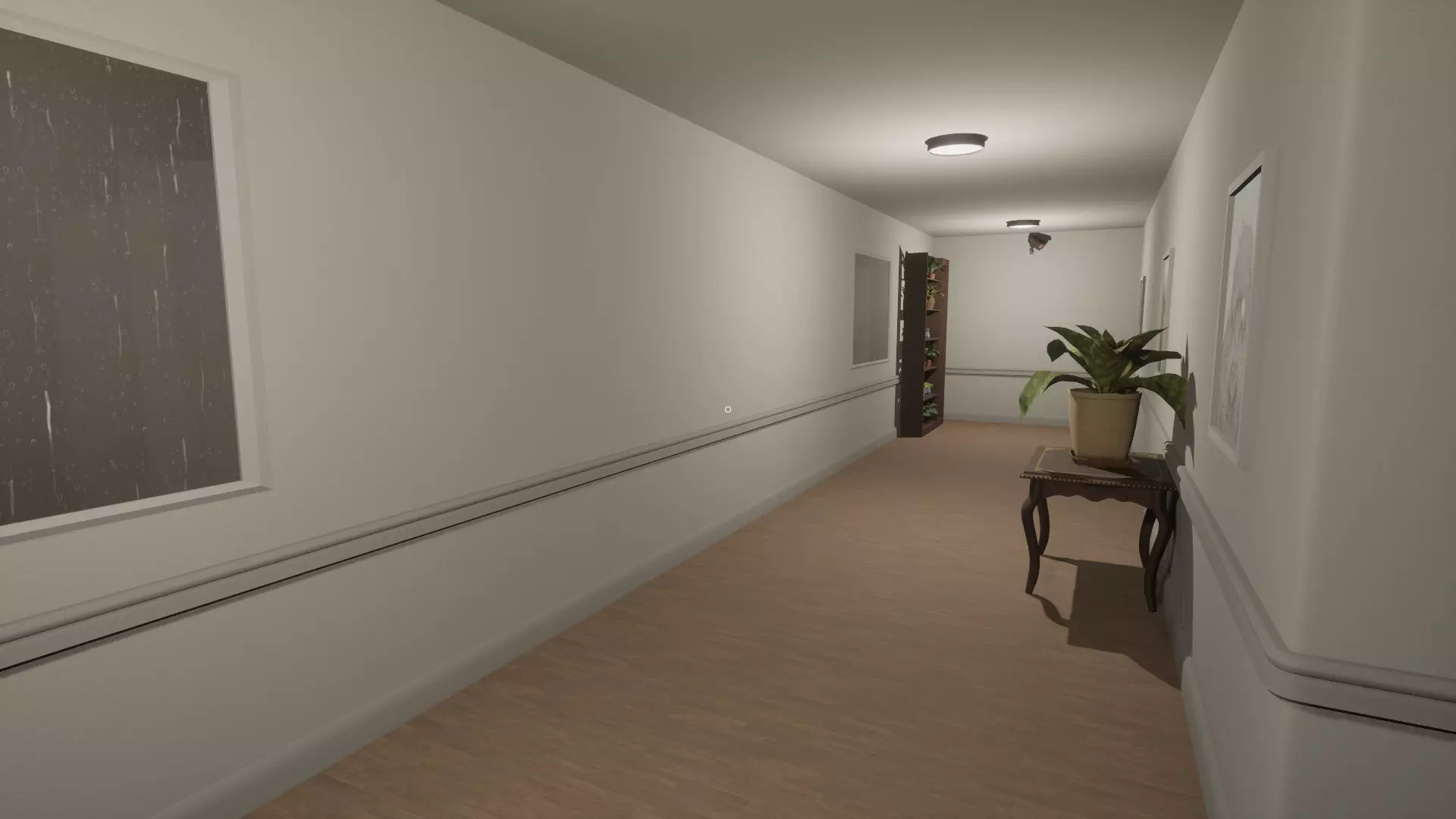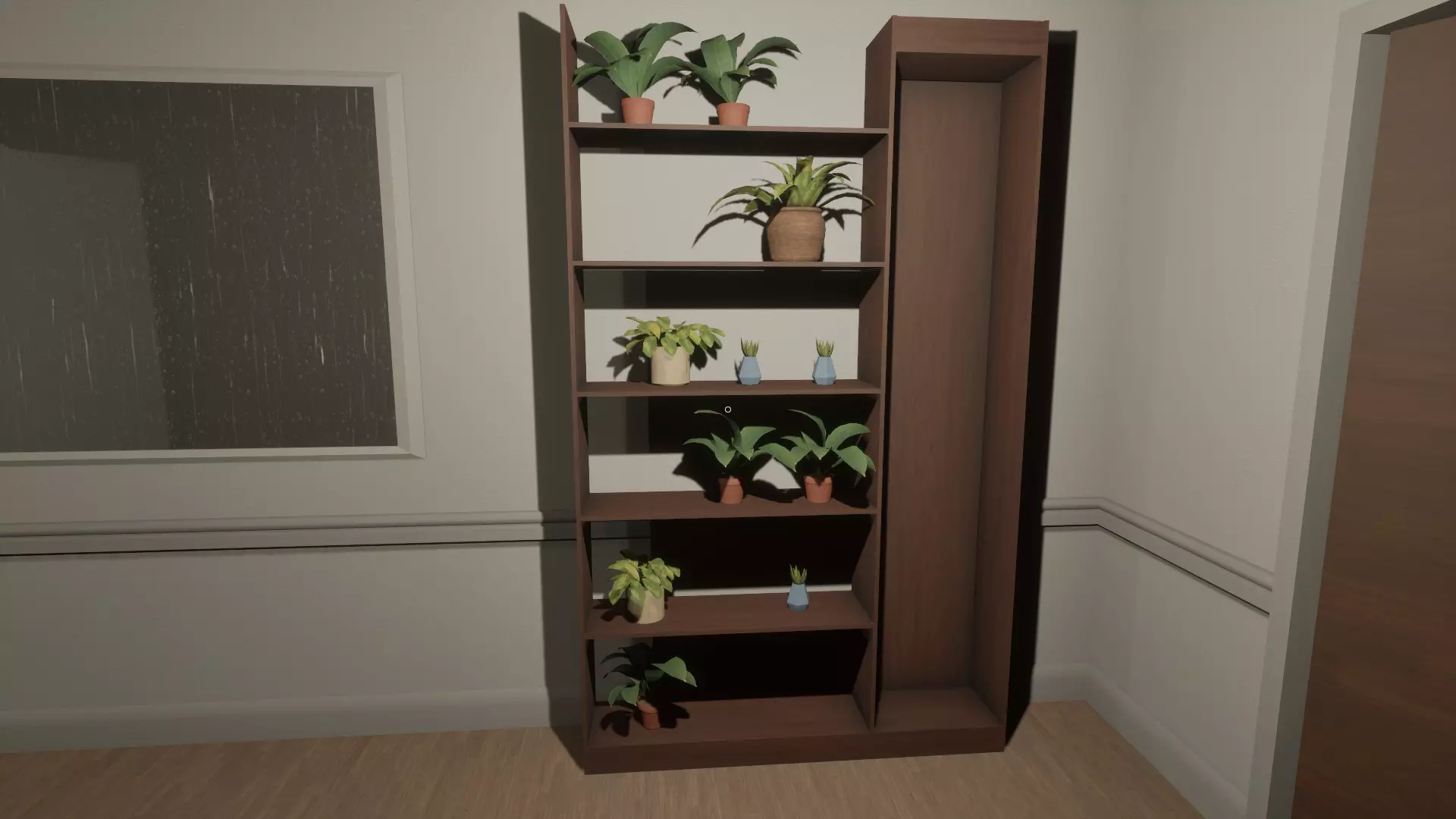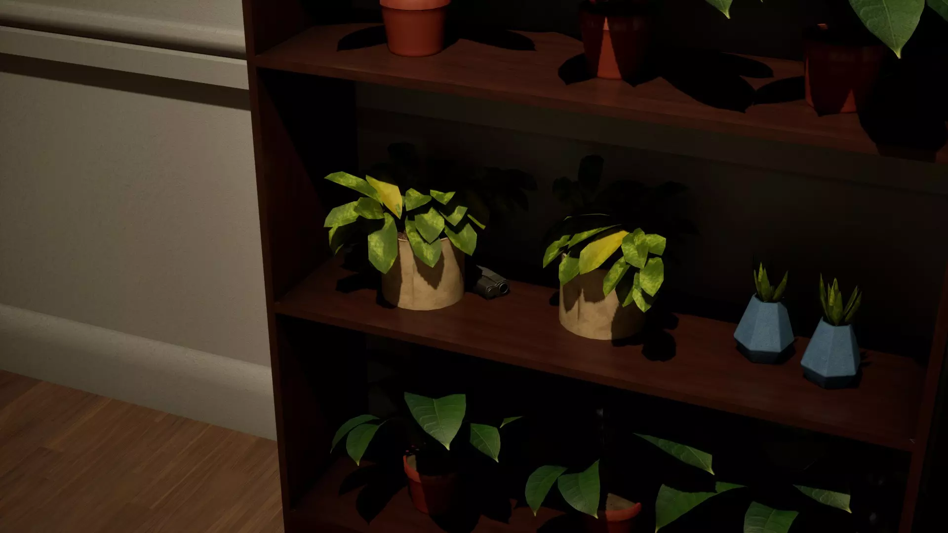 左侧走廊的架子上少了几株植物。这会解锁Needs A Green Thumb成就。