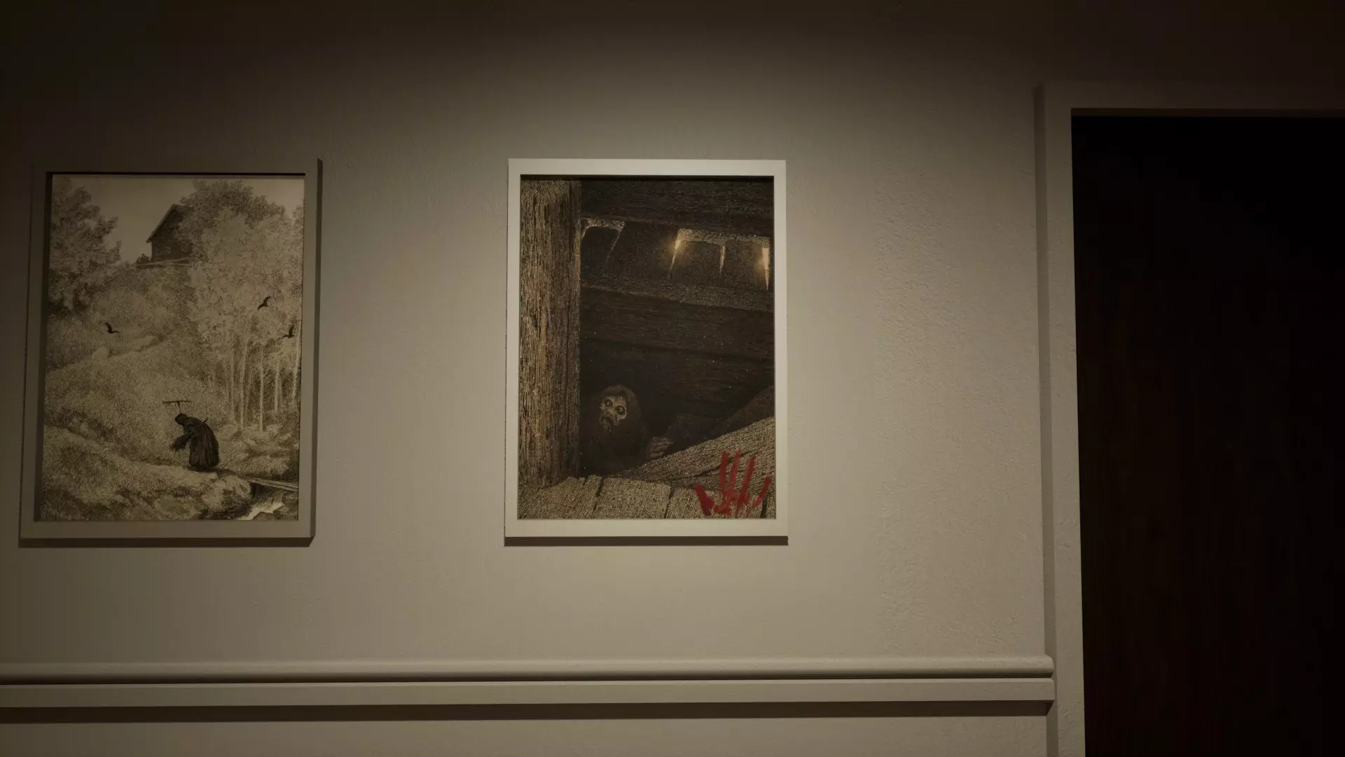 右侧走廊的楼梯画作上有一个带血的手印。