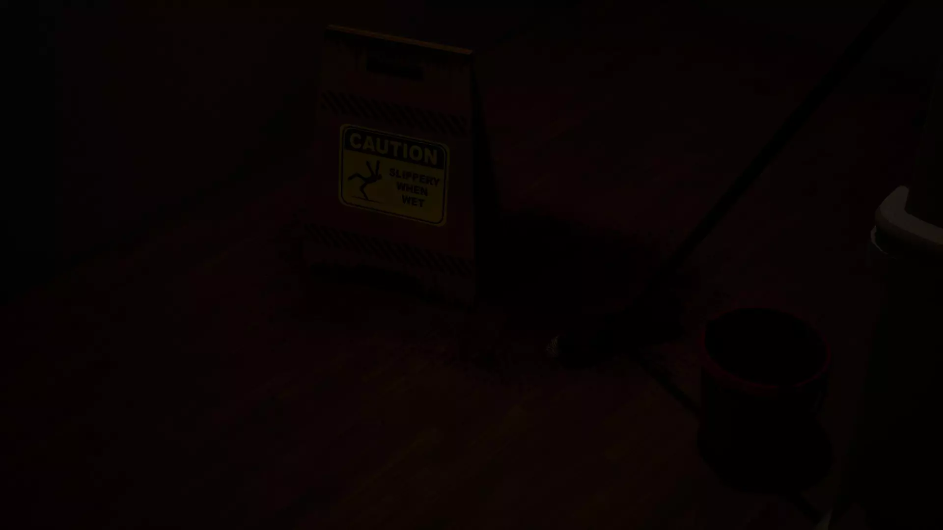 湿滑地面 楼梯间的湿滑地面警示牌下方有一处血迹。