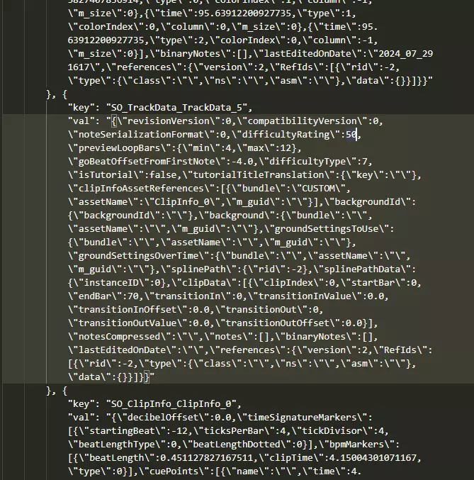 .srtb文件可以用任何文本编辑器查看,它可能是人类可读的,但默认情况下不会被格式化。设置一个好的文本编辑器能让你的工作轻松很多。 我使用VSCode(VSCodium)和Beautify扩展;或者你也可以使用Notepad++和JSON Viewer(在程序内下载),就像gav的指南中详细说明的那样。任何能够格式化json文件的文本编辑器都可以。 你需要修改三个部分。在操作前,最好先备份.srtb文件。 1. unityObjectValuesContainer 有一个名为unityObjectValuesContainer的部分。看起来是这样的:"unityObjectValuesContainer": { "values": [{ "key": "轨道信息", "jsonKey": "SO_TrackInfo_TrackInfo", "fullType": "轨道信息" }, { "key": "轨道数据_0", "jsonKey": "SO_TrackData_TrackData_0", "fullType": "轨道数据" }, { "key": "轨道数据_1", "jsonKey": "SO_TrackData_TrackData_1", "fullType": "轨道数据" }, { "key": "轨道数据_2", "jsonKey": "SO_TrackData_TrackData_2", "fullType": "轨道数据" }, { "key": "轨道数据_3", "jsonKey": "SO_TrackData_TrackData_3", "fullType": "轨道数据" }, { "key": "轨道数据_4", "jsonKey": "SO_TrackData_TrackData_4", "fullType": "轨道数据" }, { "key": "轨道数据_5", "jsonKey": "SO_TrackData_TrackData_5", "fullType": "轨道数据" }, { "key": "片段信息_0", "jsonKey": "SO_ClipInfo_ClipInfo_0", "fullType": "片段信息" }] } 你需要的代码2. 大型字符串值容器 "大型字符串值容器": { "值": [{"键": "SO_TrackInfo_TrackInfo", "值": "{ \"曲目顺序 \":0, \"曲目ID \":0, \"专辑封面引用 \":{ \"包 \": \" \", \"资源名称 \": \"V Liberty_성장통 \", \"m_guid \": \" \"}, \"背景ID \": { \"背景ID \": \"a52f0cd1a28b62b4f9868f556fd7d2c8 \"}, \"背景着色 \": { \"ID \": \" \"}, \"备用背景ID \":{ \"背景ID \": \" \"}, \"备用着色背景ID \": { \"ID \": \" \"}, \"对象替换 \":[], \"艺术家名称 \": \"(艺术家名称) \", \"合作艺术家 \": \" \", \"标题 \": \"(歌曲名称) \", \"副标题 \": \" \", \"曲目标签 \": \" \", \"谱面作者 \": \"Haxton \", \"描述 \": \" \", \"标题Y轴偏移 \":0.0,"spotify链接":" ","难度": [{"包":"自定义","资源名称":"音轨数据_0","m_guid":" ","_启用":true}, {"包":"自定义","资源名称":"音轨数据_1","m_guid":" ","_启用":true}, {"包":"自定义","资源名称":"音轨数据_2","m_guid":" ","_启用":true}, {"包":"自定义","资源名称":"音轨数据_3","m_guid":" ","_启用":true}, {"包":"自定义","资源名称":"音轨数据_4","m_guid":" ","_启用":true}, {"包":"自定义","资源名称":"音轨数据_5","m_guid":" ","_启用":true}], "音轨类型":1,"编辑器功能":" ","允许创建自定义排行榜":false}" }, 需要添加的部分已加粗并下划线。 3. SO_音轨数据_音轨数据_5