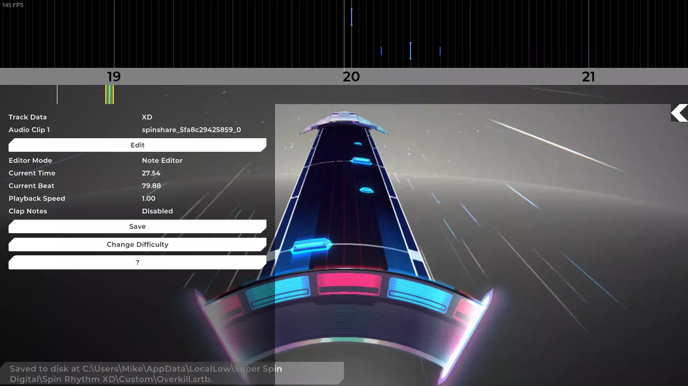 在文件末尾附近,有对实际谱面进行编码的部分。你需要为REMIXD难度制作一个这样的部分。例如: { "key": "SO_TrackData_TrackData_5", "val": "{ \"revisionVersion \":0, \"compatibilityVersion \":0, \"noteSerializationFormat \":0, \"difficultyRating \":50, \"previewLoopBars \":{ \"min \":4, \"max \":12}, \"goBeatOffsetFromFirstNote \":-4."0, "难度类型":7, "是否为教程":false, "教程标题翻译":{"键":" "}, "片段信息资源引用":[{ "包":"CUSTOM", "资源名称":"ClipInfo_0", "m_guid":" "}], "背景ID":{"背景ID":""}, "背景":{"包":"", "资源名称":"", "m_guid":""}, "使用的地面设置":{"包":"", "资源名称":"", "m_guid":""}, "随时间变化的地面设置":{"包":"", "资源名称":"", "m_guid":""}, "样条路径":{"rid":-2}, "样条路径数据":{"实例ID":0}, "片段数据":[{ "片段索引":0, "起始小节":0, "结束小节":70, "淡入过渡":0, "淡入过渡值":0.0, "淡入过渡偏移":0.0, "淡出过渡":0, "淡出过渡值":0.0, "淡出过渡偏移":0. 操作完成! 如果游戏出现异常,你可能需要删除.srtb文件。 游戏内无法修改难度,必须通过代码进行编辑。