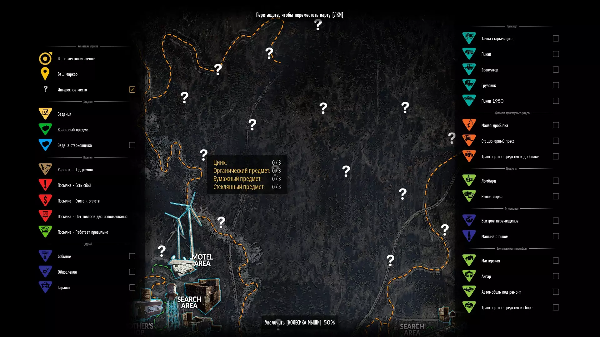 材料 我不会去写那些随处可见的铸铁、铝、铁等材料——在拆解汽车时会大量获得这些东西。 锌、纸张、玻璃:请在地图上开启兴趣点显示。这些材料会在兴趣点大量出现。