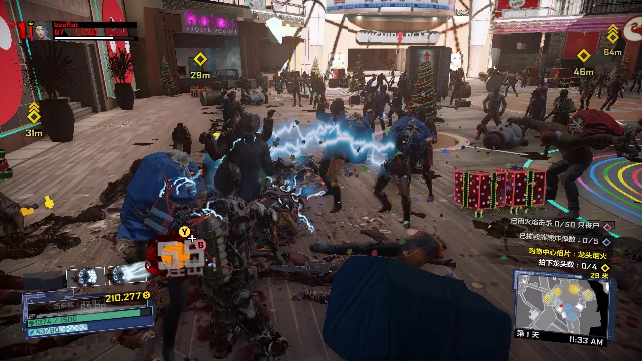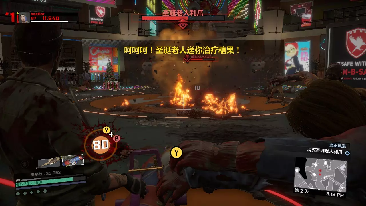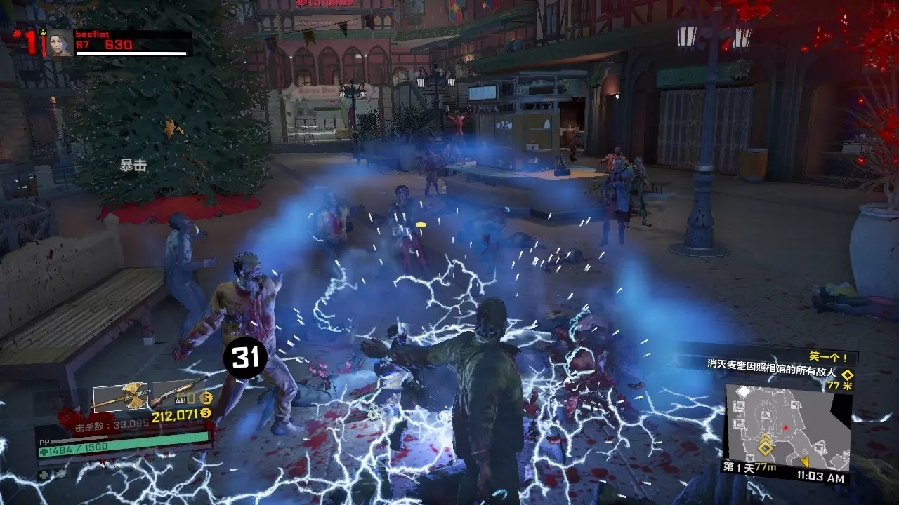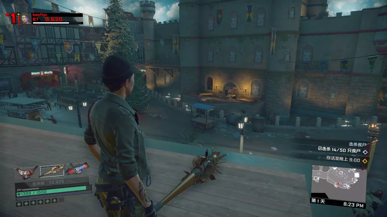 第一天剩下的时间如何打发呢?你可以从布拉茨男爵旁边的楼梯上楼,来到型男设计师屋顶上坐等9点到来,僵尸是一定不会爬上这个地方的。也可以去玩具店那边合成旋刃鬼轮车,用这个载具刷点僵尸。 第一关内击杀BOSS 50次的打法:第二天 在第一天辛苦而充分的准备下,我们的第二天将会过得很快而且很简单。 第二天 第一章第二天一共有两个任务。两个任务完全随机,但是都很好打。 第一个任务分以下几种类型: 1、中世纪小镇内拍照或者收集凝固汽油弹来炸开通路,或者圣诞节广场那里用装饰品装饰圣诞树,或者排除圣诞广场上的炸弹礼物。这一类可以配合肉酱炸药吸引敌人来打。2、清除圣诞广场附近两个区域内的全部僵尸,也有可能是击杀新鲜僵尸或者进化僵尸,只有两只,不足为惧。如果完成第二个任务后还有多余的近战武器或霰弹枪,可以用来对付它们。但三八火箭筒务必留给头目,实在没办法还有黄金横扫棒。 3、把危险品带给XX专家。没别的技巧,就是跑酷。任务很简单,但携带危险品时会持续掉血,记得带些食物以防万一。 第二个任务有以下几种类型: 1、使用枪械/硫酸/电击/冰冻/火焰/钝器/利刃击杀25个僵尸,很简单,用我们第一天准备的那些武器即可。 2、使用漏硫酸战锤击杀25个敌人,漏硫酸战锤会使你的生命值降低,但这个任务依然简单,备好食物以防万一。