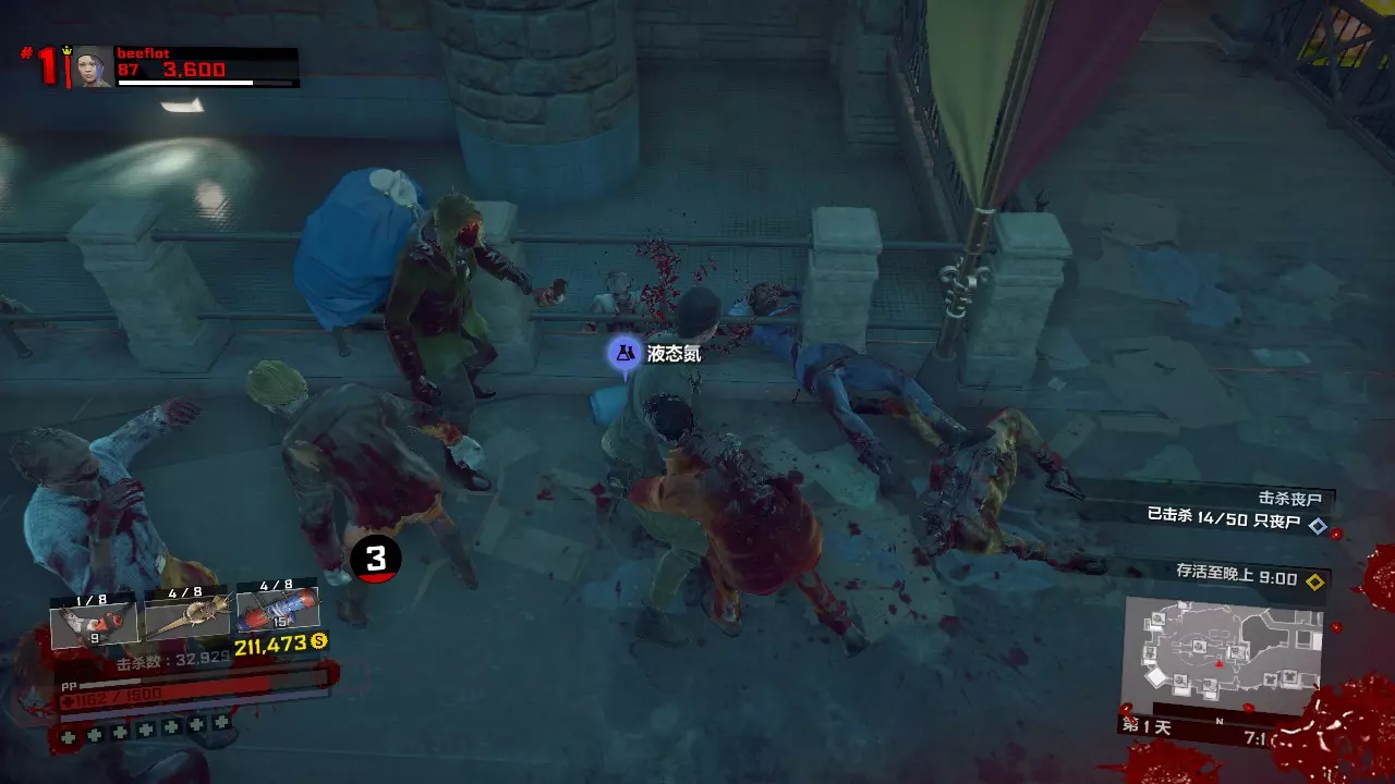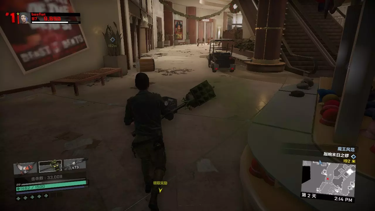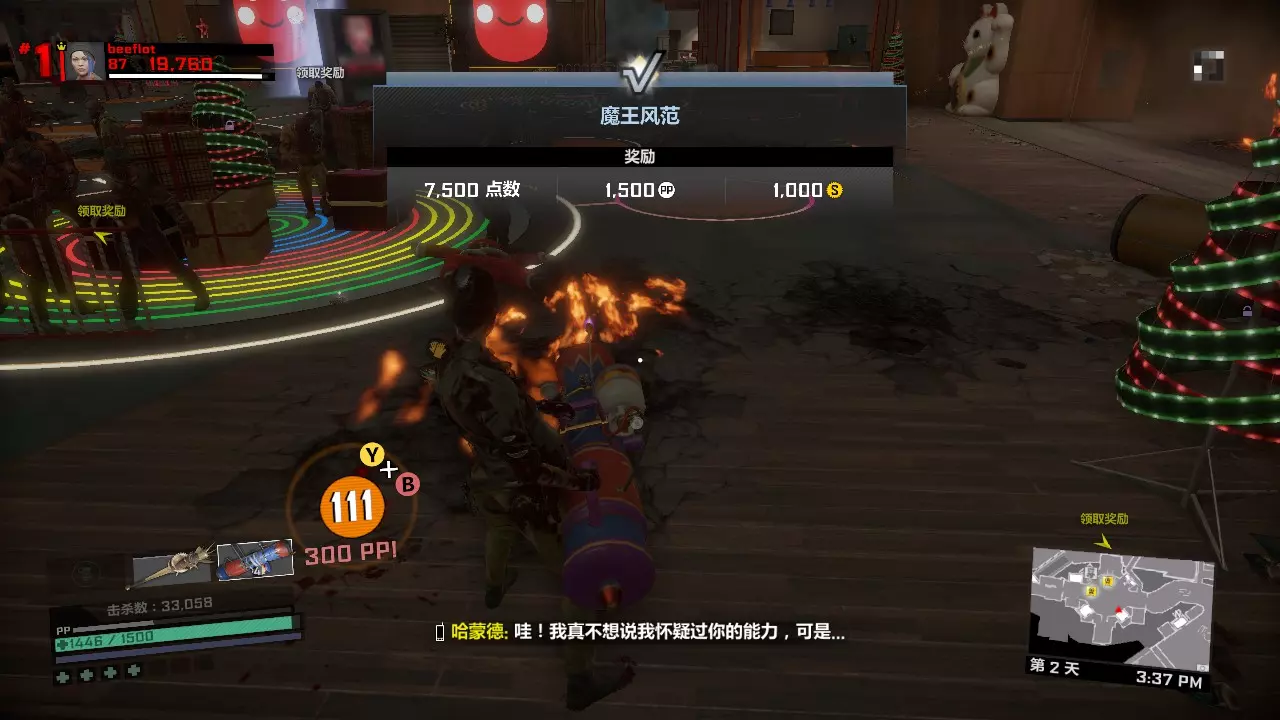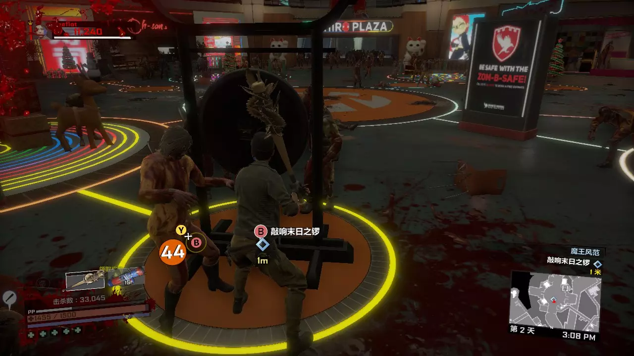 第一天剩下的时间如何打发呢?你可以从布拉茨男爵旁边的楼梯上楼,来到型男设计师屋顶上坐等9点到来,僵尸是一定不会爬上这个地方的。也可以去玩具店那边合成旋刃鬼轮车,用这个载具刷点僵尸。 第一关内击杀BOSS 50次的打法:第二天 在第一天辛苦而充分的准备下,我们的第二天将会过得很快而且很简单。 第二天 第一章第二天一共有两个任务。两个任务完全随机,但是都很好打。 第一个任务分以下几种类型: 1、中世纪小镇内拍照或者收集凝固汽油弹来炸开通路,或者圣诞节广场那里用装饰品装饰圣诞树,或者排除圣诞广场上的炸弹礼物。这一类可以配合肉酱炸药吸引敌人来打。2、清除圣诞广场附近两个区域内的全部僵尸,也有可能是击杀新鲜僵尸或者进化僵尸,只有两只,不足为惧。如果完成第二个任务后还有多余的近战武器或霰弹枪,可以用来对付它们。但三八火箭筒务必留给头目,实在没办法还有黄金横扫棒。 3、把危险品带给XX专家。没别的技巧,就是跑酷。任务很简单,但携带危险品时会持续掉血,记得带些食物以防万一。 第二个任务有以下几种类型: 1、使用枪械/硫酸/电击/冰冻/火焰/钝器/利刃击杀25个僵尸,很简单,用我们第一天准备的那些武器即可。 2、使用漏硫酸战锤击杀25个敌人,漏硫酸战锤会使你的生命值降低,但这个任务依然简单,备好食物以防万一。