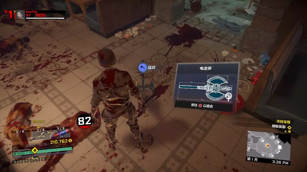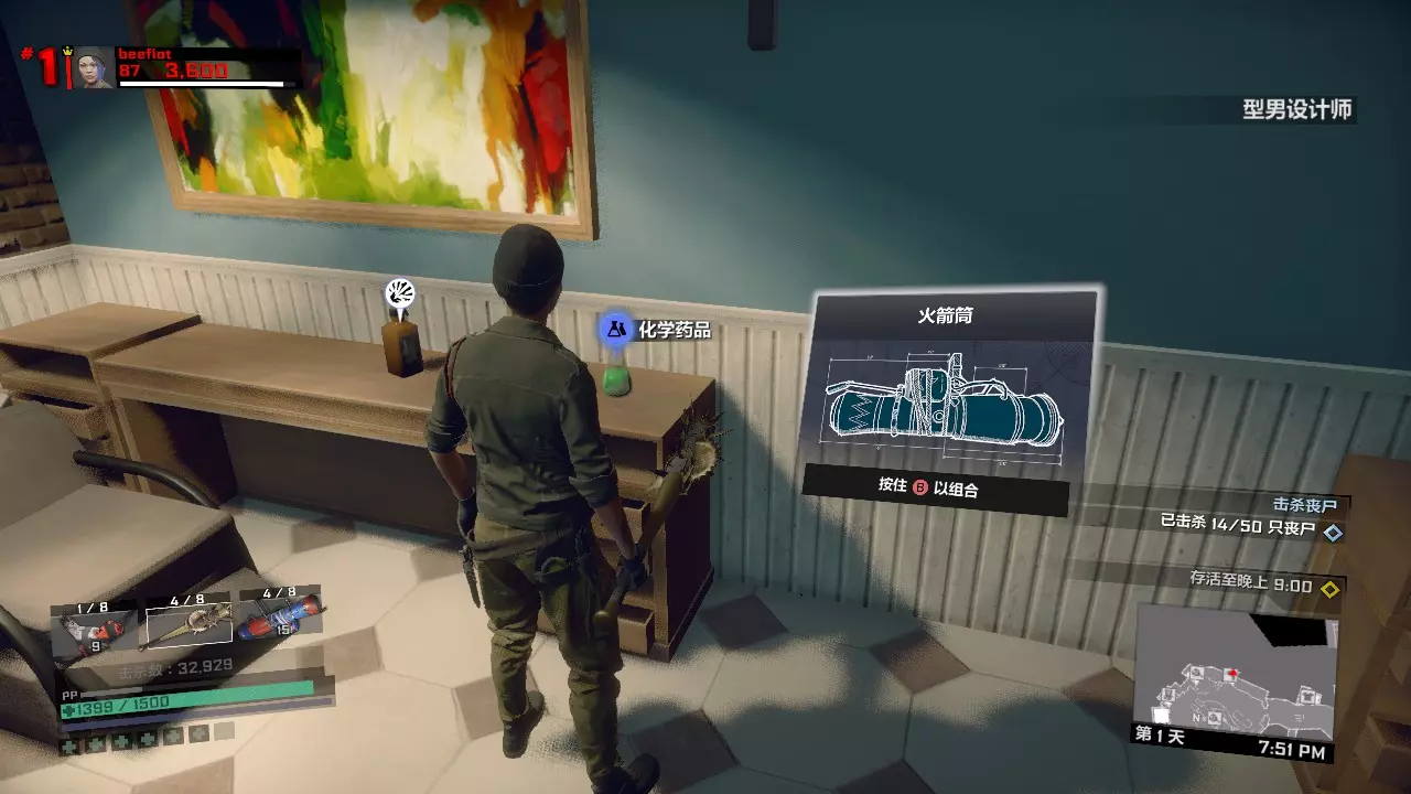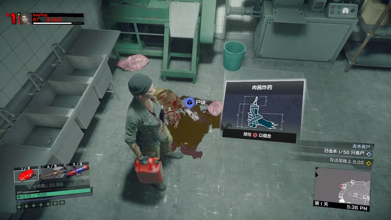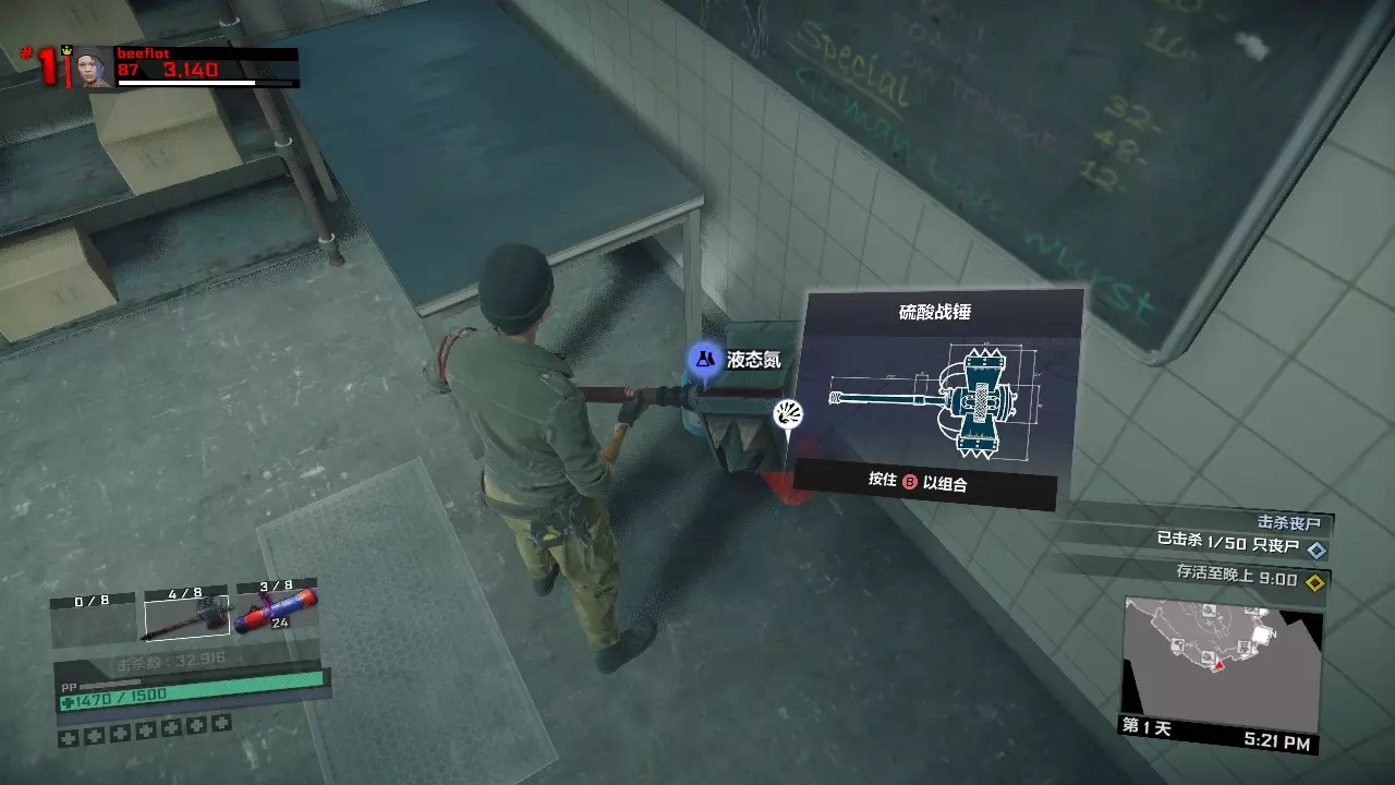 接下来,进入布拉茨男爵餐厅的厨房内。 用桌子上的战锤和旁边的液氮合成硫酸战锤,如果第二天遇到用硫酸或者钝器击杀25个敌人的任务,可以用这把武器来完成。 用尸体边上的尸块和燃料瓶合成肉酱炸弹,如果第二天遇到拍照或者找凝固汽油弹的任务,可以扔一个肉酱炸弹吸引僵尸们的注意,然后趁机拍照或者拿走凝固汽油弹。