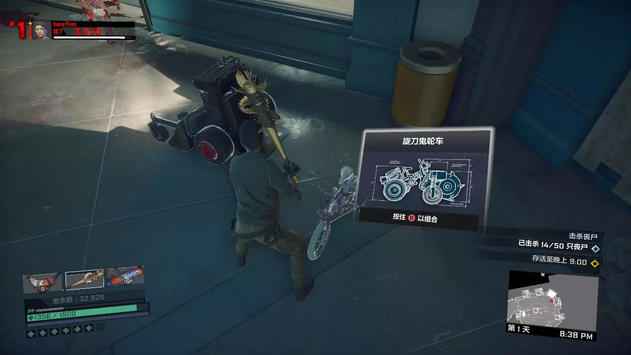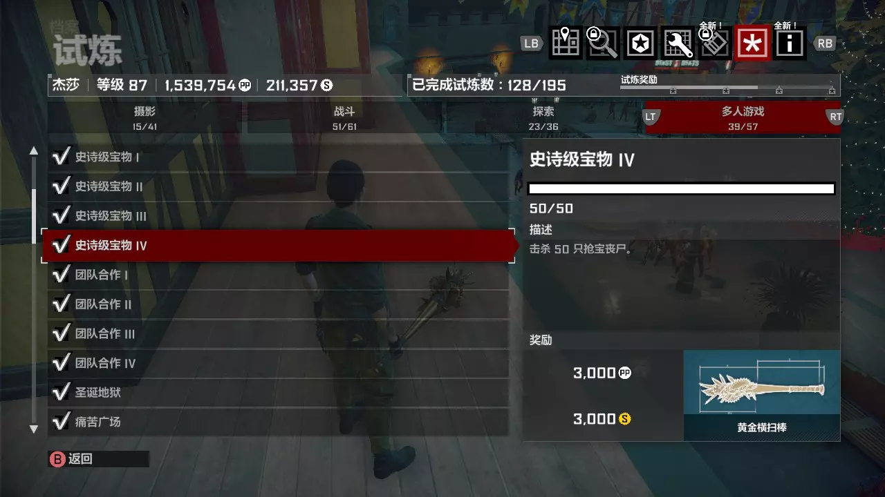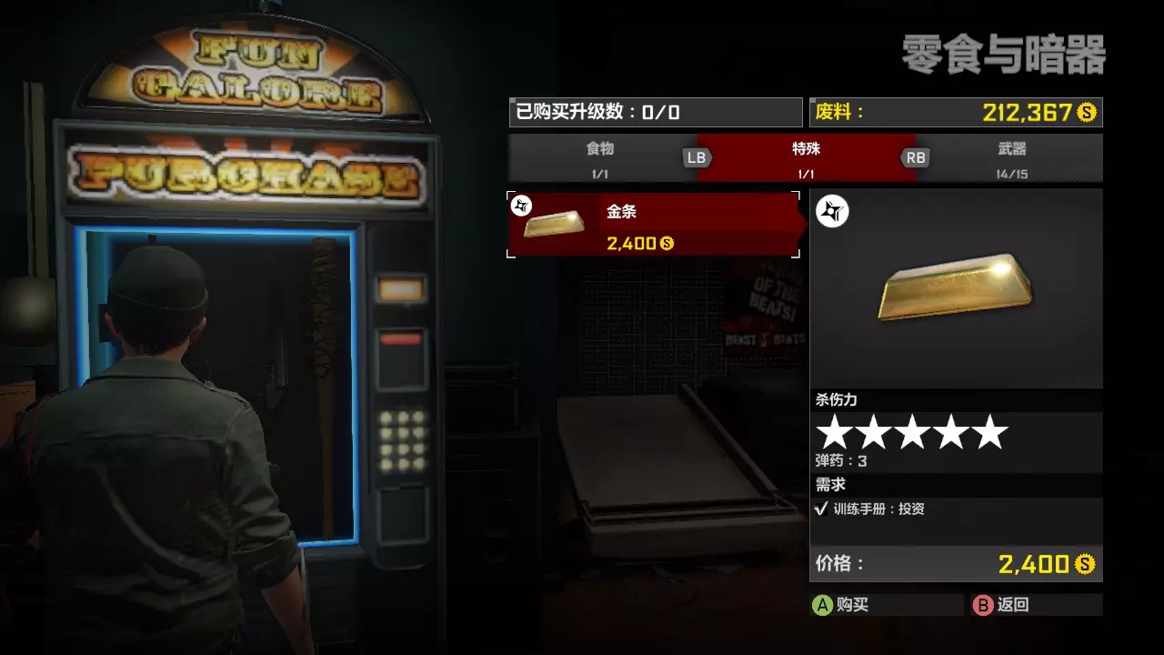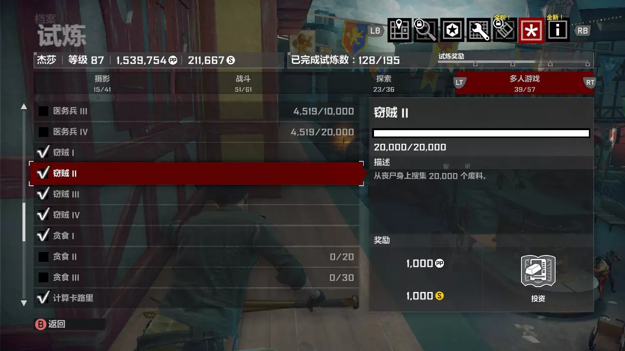 我们要做的准备工作只有两个:其一是解锁黄金横扫棒蓝图,使用这个武器的话,第一章第一天完全可以不用其他武器,只用这一把就够,而更强力的非黄金武器则可以用来完成第二天的任务以及头目战。其二是解锁线上模式的金砖购买,也就是投资试炼。 黄金横扫棒蓝图需要我们击杀50只抢宝丧尸,也就是背着背包的新鲜僵尸。而投资试炼需要我们从僵尸身上收集2万个废料,也就是游戏内齿轮形状的金钱。这两个试炼可以同时完成!只需要第二章开头的喜一郎广场场景。