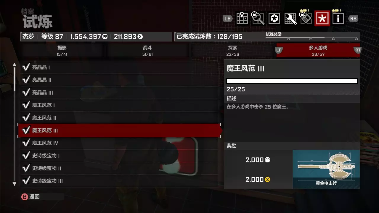 来到喜一郎广场,敲响末日之锣BOSS就会出现,这个BOSS非常容易对付,使用三个火箭筒就能轻松击败它。需要注意的是,如果和队友联机作战,必须两人都在喜一郎广场内才能敲响末日之锣。 击败BOSS后,试炼计数会永久保存,无需打完第二天,此时可以选择退出并返回大厅,然后进行第二轮刷取。 黄金电击斧