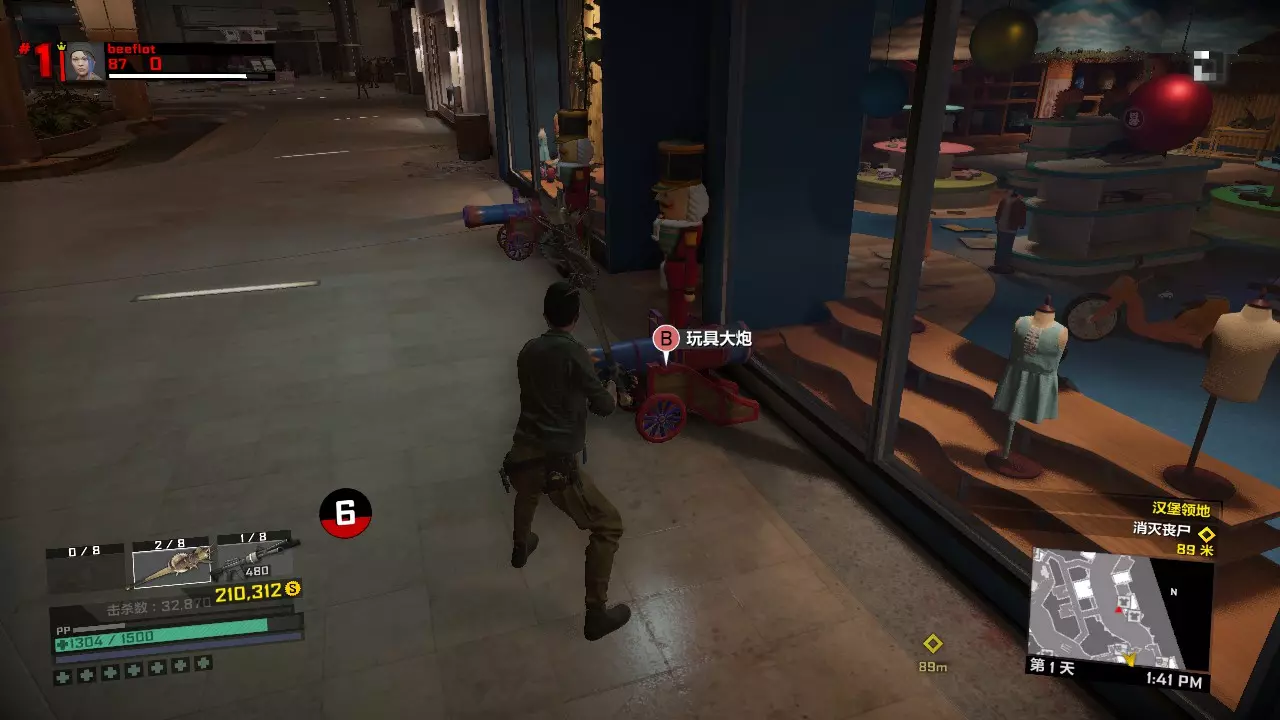然后前往旁边的玩具店再捡起一个玩具大炮。玩具大炮和化学类道具可以合成火箭筒,这是对抗首领的利器。目前我们手上已有三把玩具大炮,接下来将介绍三个化学道具的位置。