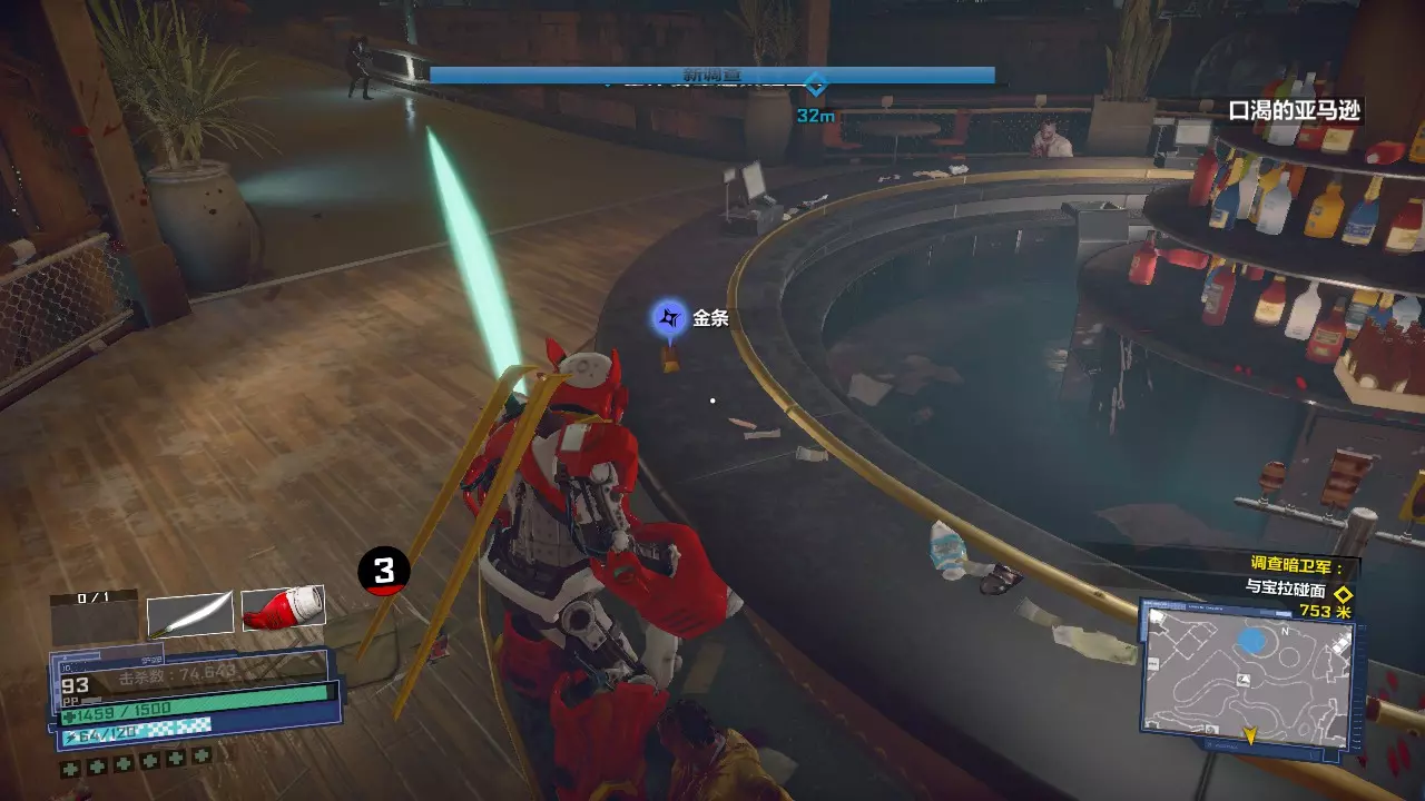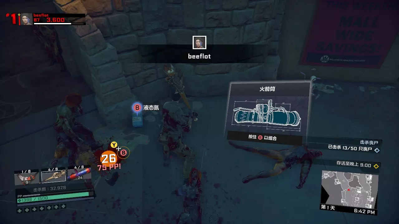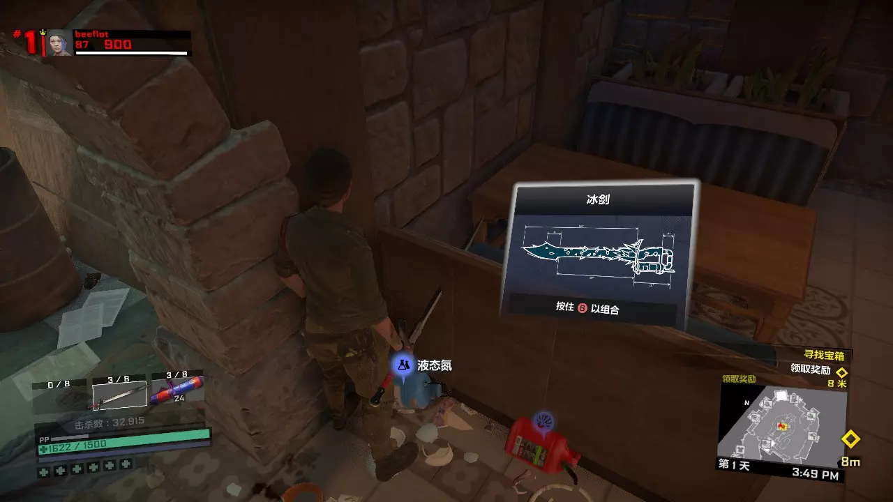 接下来来到一个物资非常丰富的地方,汉堡领地。 手提音响和地上的战斧可以合成,如果第二天遇到使用电流击杀25个敌人的任务,可以使用这把武器。 阔剑或者日本刀,可以和液氮瓶合成冰剑,如果第二天遇到用冰冻或者用利刃击杀25个敌人的任务,可以用这把武器来完成(如果是火焰击杀而你等级低,武器栏又不够的话,可以第二天临时换成火焰剑,燃料瓶就在旁边)。