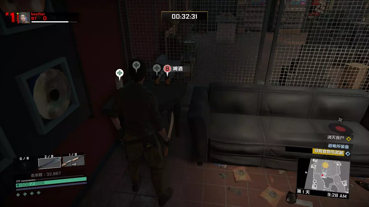 然后拿起沙发上的开山刀,后面合成武器用。如果食物栏位还富余,可以捡起沙发另一端的食物。
