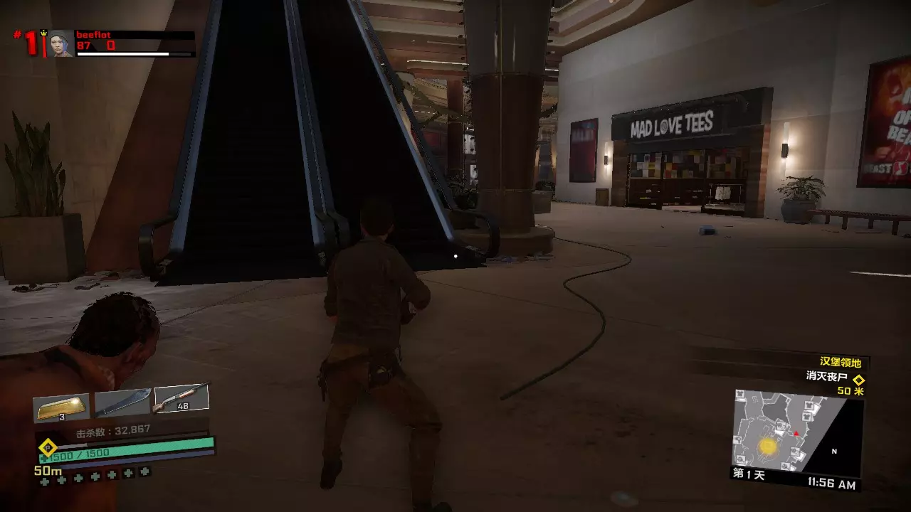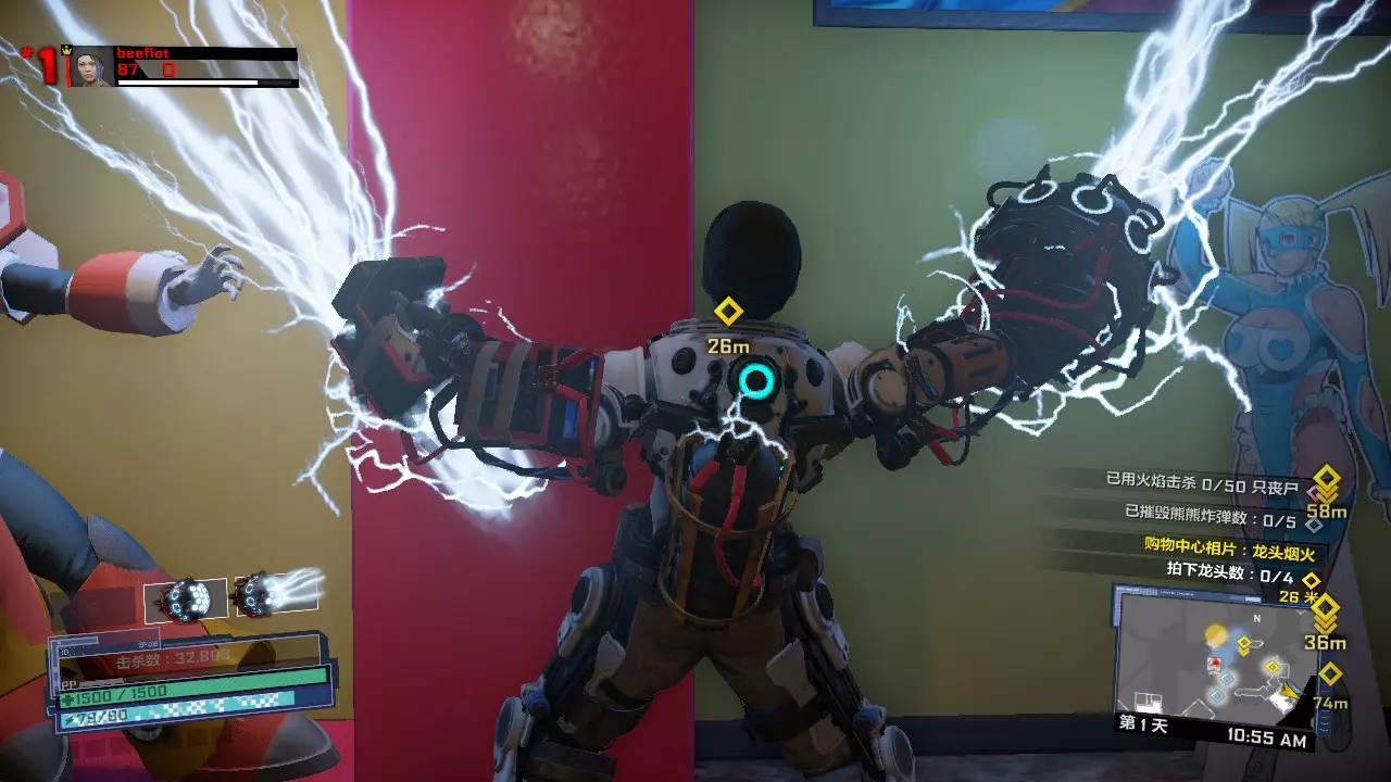 喜一郎广场内有不少蓝色背包的抢宝丧尸,蓝色背包抢宝丧尸可以掉落大量废料(金币)。这样一来,我们在击杀抢宝僵尸的同时还能刷废料,也就是同时进行两项准备工作。90秒动力甲时间足够杀光一个广场的丧尸,所以我们还可以刷连击来涨经验升级。喜一郎广场得天独厚的环境为我们提供了一石三鸟的绝佳机会! 如果完成任务期间仍然感觉吃力的话,可以先收齐线上模式的训练手册。 第一关内击杀BOSS 50次的打法:第一天 本游戏的线上模式,每章都有两天,而第一天最重要的就是收集资源,为第二天BOSS战做准备。