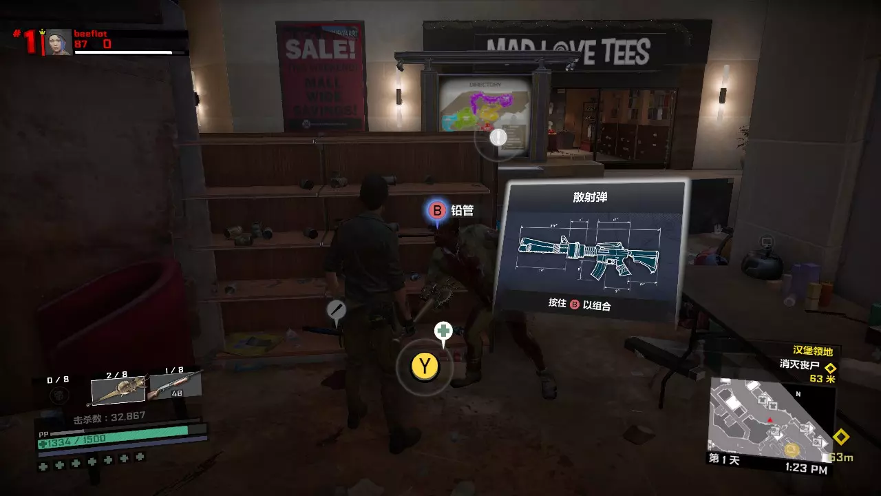 从多德制药出来后,下电梯,电梯底下的铅管和杰莎的霰弹枪可以合成散射弹。在《丧尸围城3》中,散射弹就是神器,这代同样很好用。 如果第二天遇到用枪械击杀25个丧尸的任务,用它来完成会绰绰有余。要是不小心用完了杰莎的霰弹枪,可以去中世纪小镇中央的汉堡领地捡一把突击步枪,然后用它来合成散射弹。