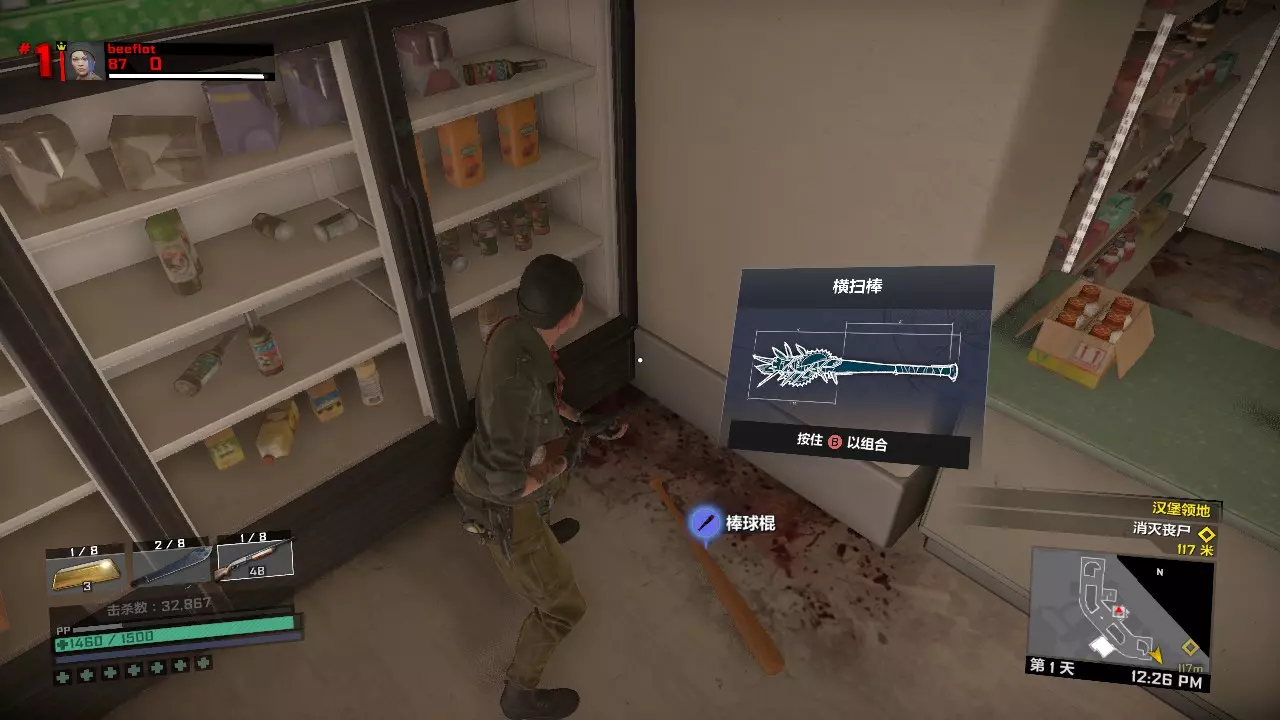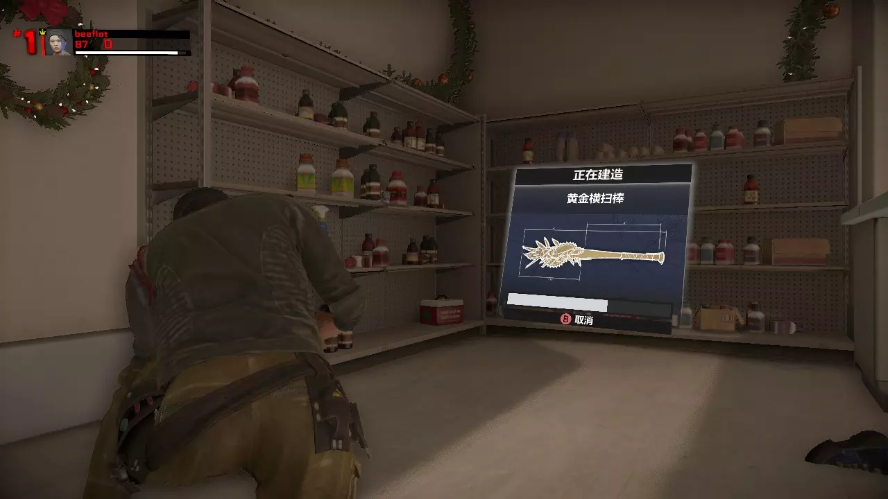 用店内棒球棍和避难所内的开山刀合成横扫棒,再用横扫棒和金块合成黄金横扫棒。第一章第一天的任务一定是清除中世纪小镇范围内某家店铺的全部敌人,可以用黄金横扫棒完成,其他武器可以留给第二天完成任务或打BOSS用。所以黄金武器的作用非常大,在耐久掉得很快的线上模式中可以节省不少物资。