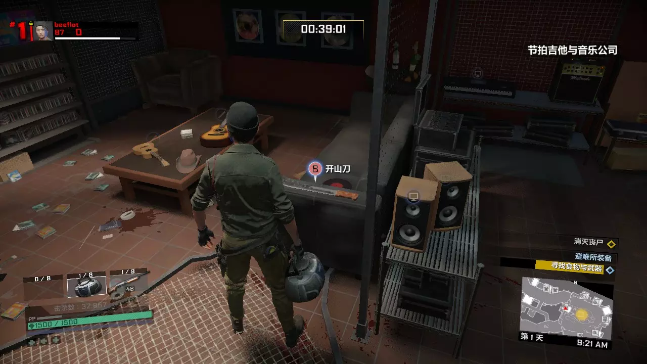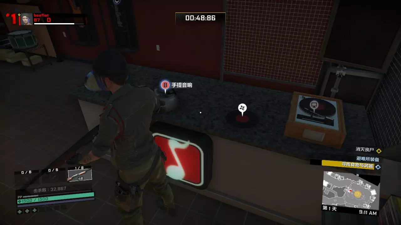 避难所内准备时间,首先捡起手提音响和桌子上的药。