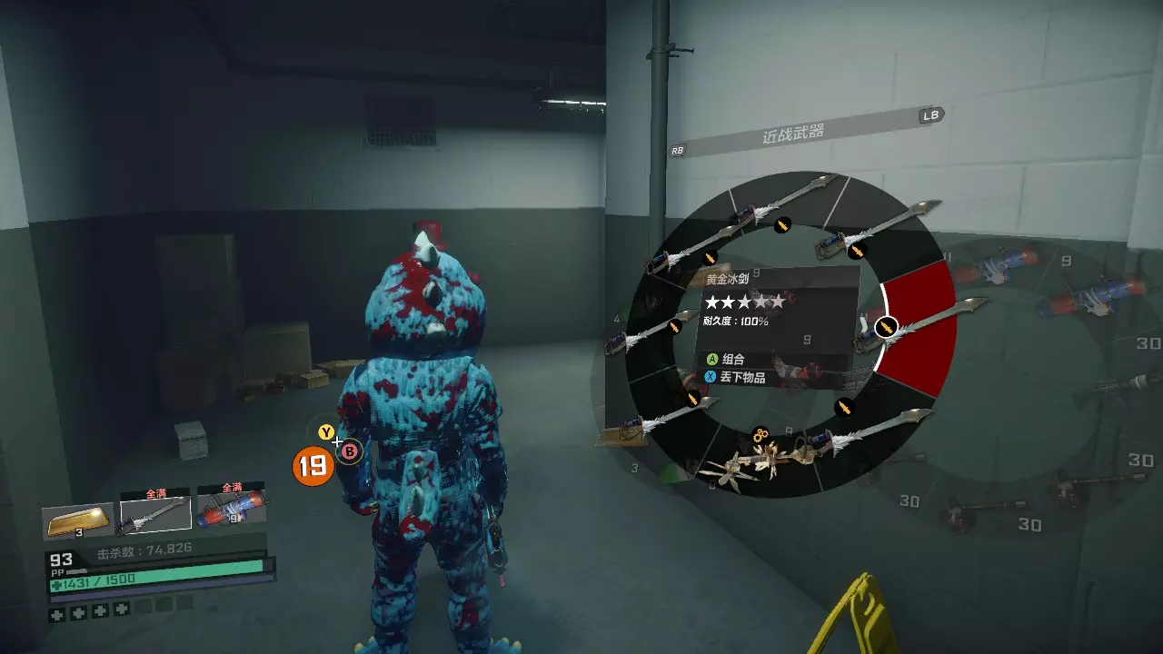 打到第25次的时候,会解锁一把实用性位于本游戏前三的超强神器黄金电击斧,对抢宝丧尸和一般僵尸都是一斧子砍死,还带有范围麻痹的电击效果;连击蓄力技能是大范围放电。解锁了这个后,再刷BOSS就不用合成黄金横扫棒了,直接合成电击斧即可。 故事模式刷黄金武器方法 故事模式困难难度和线上模式武器耐久差不多,掉的很快,如果有了我们刚刚刷到的黄金冰剑的话,会轻松很多。