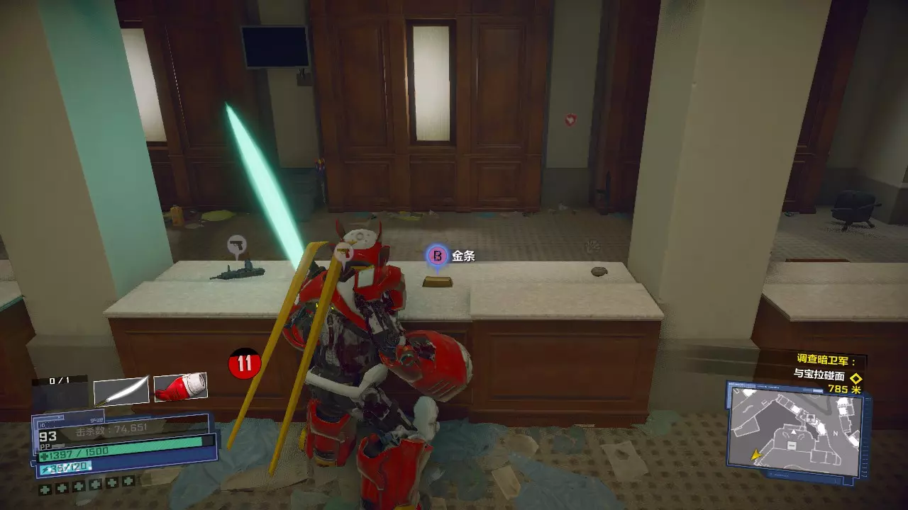 然后来到第一章主线剧情必经的旅馆,前台处就是第二块金砖。 拿到两个金砖后,马上合成黄金武器,以确保下一轮中金块刷新。