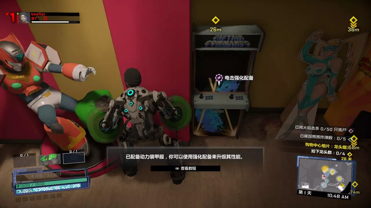 第二章初始避难所是一家街机厅,里面的街机可以给动力甲进行电属性升级。在贩卖机内购买X神拳即可自动获得动力甲,动力甲状态下捡起街机即可获得升级。然后开始屠杀喜一郎广场内的敌人。建议避难所打开后再购买动力甲,以免浪费动力甲时间。