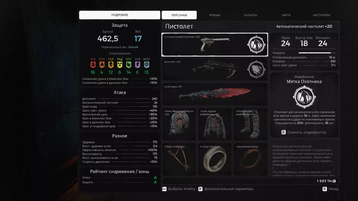 我使用这个配装来速通地图,以及应对特定的 Boss(比如【分裂者】必须用重型武器)。其核心机制是,当圆盘从【圆盘发射器】反弹时,有几率触发【匪徒护甲】模组的效果。第二枚戒指可根据个人需求替换。