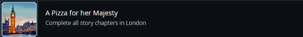 提示 这里提到的前四个成就应该相对容易达成。 首选配料 我制作了一个包含所有可用配料的披萨,并只出售这种披萨。成就立即就解锁了,尽管在青少年和学生群体中没有显示任何相关内容。 最后三个成就不容易获得,它们是一场大型的“找东西”挑战。因此,它们至少应该保持一定的神秘感,你们需要通过一系列剧透按钮来点击查看。自己决定想要多少提示吧!它们遵循以下模式:城市、大致位置、带截图的位置。祝你们搜索顺利! 嬉皮士人脉 你们要寻找一辆嬉皮士居住的厢式货车。看来这不是一辆行驶中的车…… 1. 提示:你们要找的厢式货车在罗马城。 2. 提示:它位于东部(右侧)的大致中间位置。 3. 提示: