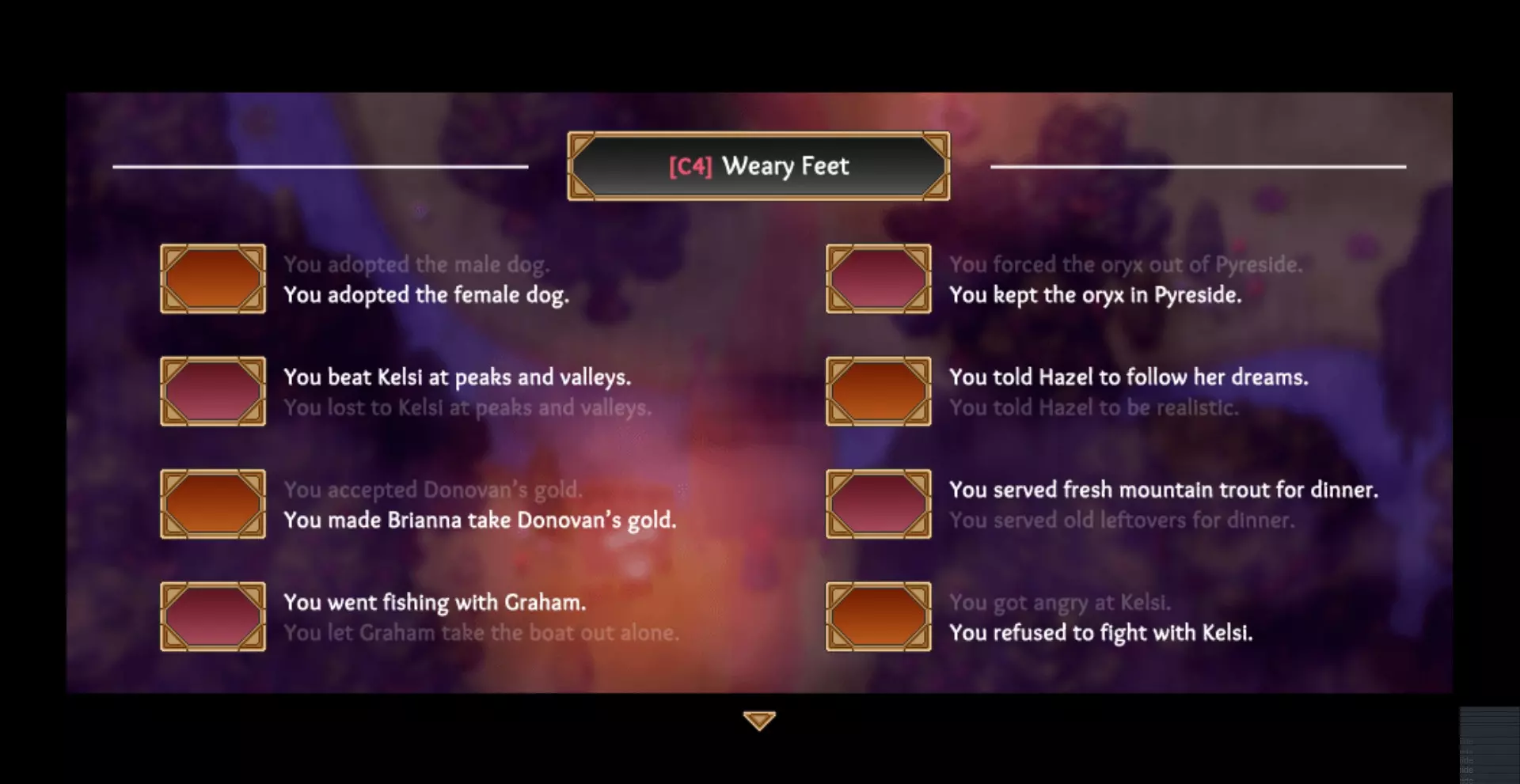 第四章 - 在药剂师商店与克莱尔交谈,以获得Found A Place成就。 - 留下羚羊。 - 阅读黑兹尔房间里的留言,在树林里与她交谈并提及那封信。告诉她去追寻自己的梦想。 - 在告别时,对凯尔西选择保持冷静、保持冷静、保持冷静、你可以留在这里、我爱你/我会想你。 - 不要接受多诺万的金子。