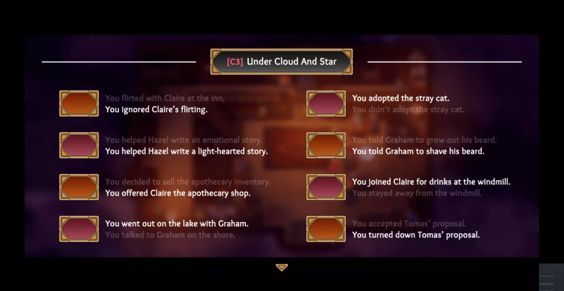 第三章 - 在森林中与艾拉对话,可获得【Always Sisters】成就。 - 进入森林后尝试返回村庄,找到流浪猫。收养它可获得【Hide The Tuna】成就。 - 保住药剂师的店铺,与精灵克莱尔在灯塔小酌,并邀请她在那里工作。 - 要么与托马斯结婚,要么让艾萨克使用第一章中从皇冠那里得到的钱。保住药剂师店铺且不与托马斯结婚的话,风车会自动用皇冠的钱修好。 - 与黑兹尔对话并帮她完成故事。任何结局均可,但我选择了轻松愉快的结局。