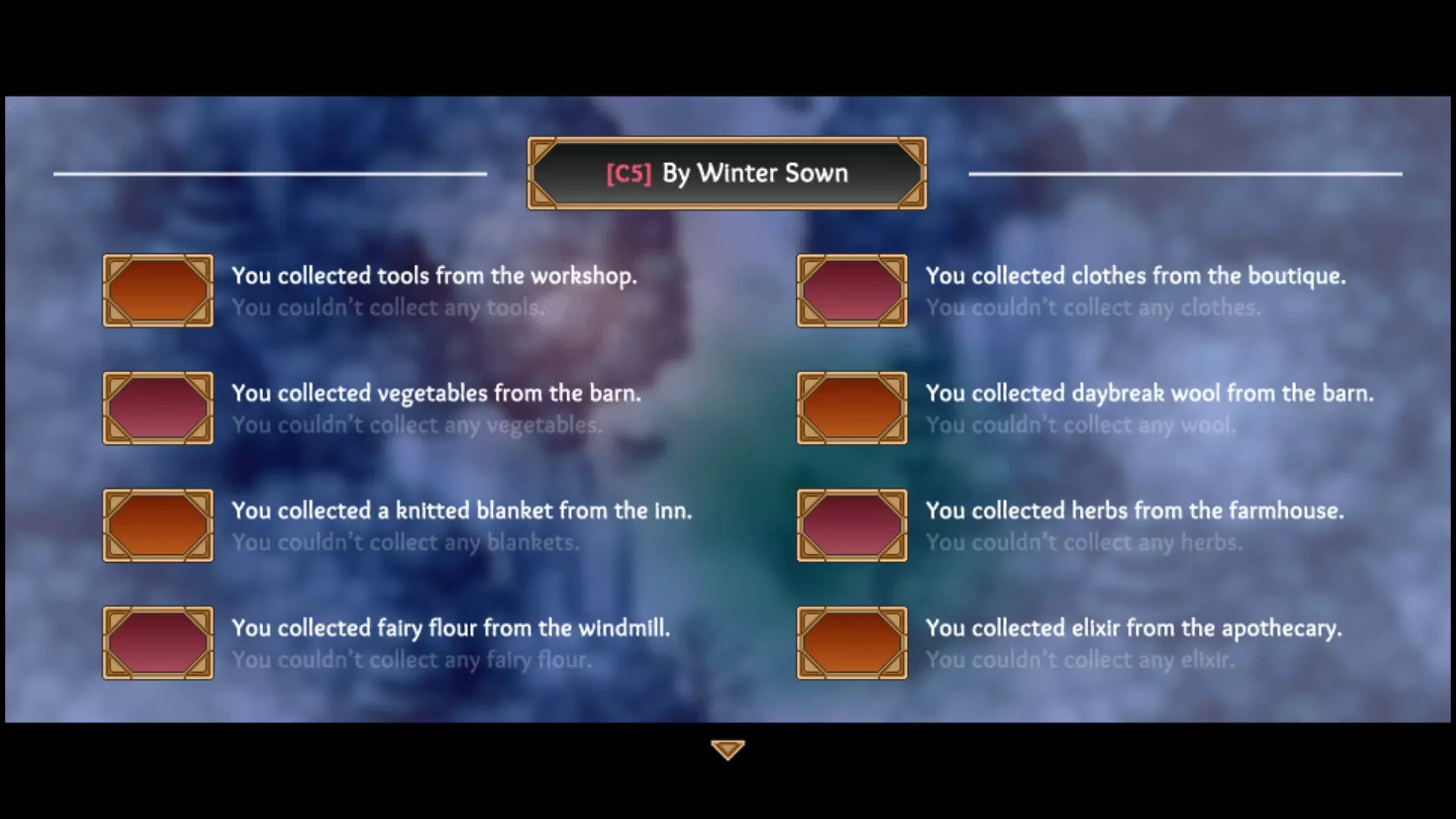 第五章 尽可能收集更多物资,它们分布在各个建筑中。 - 【希尔与 hammer 铁匠铺】二楼的落满灰尘的工具箱。 - 【邓尼特农舍】的干草药。 - 【邓尼特谷仓】的腌菜,以及黎明羊毛或月光牛奶中的任意一种。 - 【 Blossom 精品店】的衣物捆。 - 【 Fallstar 药剂师】的治疗药剂。 - 风车处的仙子面粉。 - 【沉睡之龙旅馆】艾拉房间里的针织毛毯。