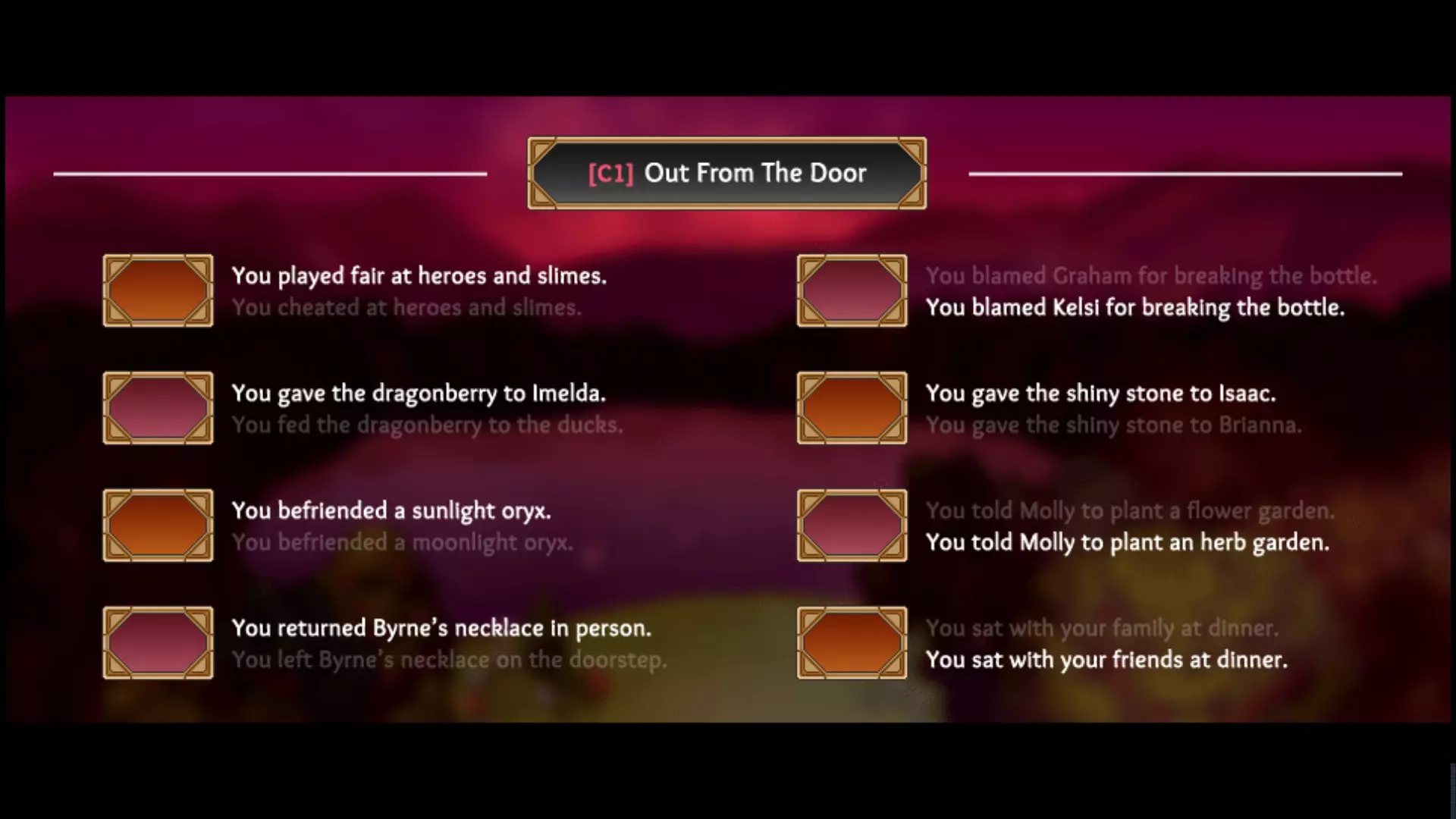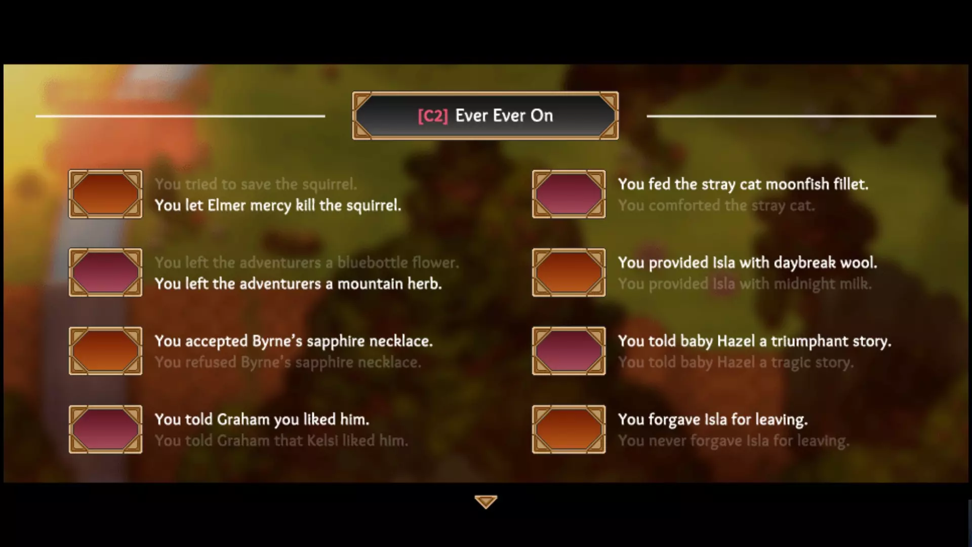 本节内容并非攻略,仅说明达成100%成就所需的选择。 第一章 - 将龙莓交给伊梅尔达。(你将学会派的食谱) - 和羚羊成为朋友。 - 归还伯恩的项链。 - 告诉莫莉种植香草园。 - 将闪亮的石头交给艾萨克。 其余选择无关紧要。如果你责怪了凯尔西,可以通过学习房屋里某张纸条上的唤鸡口哨,然后在村子里吹口哨唤来小鸡并带给凯尔西,以此与她和好。这样你也能将项链归还给伯恩。