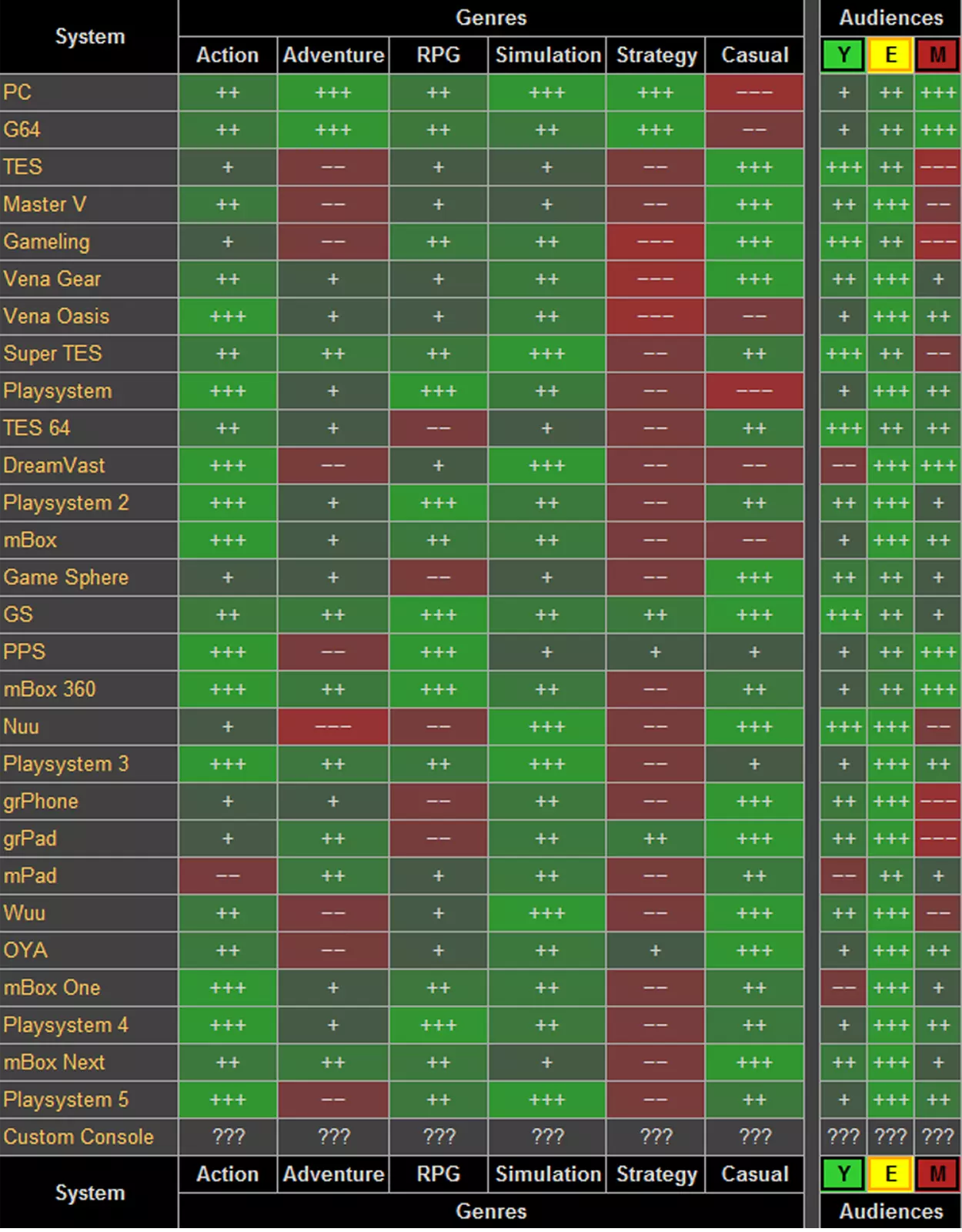 这是一款由GreenHeart Games开发、Klugs兄弟设计的经济模拟游戏,于2013年12月10日发行。游戏的核心玩法是让玩家穿越回20世纪80年代,有机会创立自己的游戏开发公司。游戏的核心目标是制作属于你自己的游戏,你将从车库起步,初始预算为80,000(8万)。如果你懂得如何制作出畅销的游戏,就能将这笔资金发展成10亿(1000M)。在设计你的电子游戏时,最关键且必须考虑的是主题与类型的组合。如果你选择像奇幻和冒险这样的优秀主题组合,游戏将会售出大量副本,并获得9分或10分的高分;但如果是军事和冒险这种糟糕的组合,你的游戏几乎卖不出去,最终会导致亏损。 游戏评分方式: 游戏会对你设计的电子游戏进行1到10分的评分,1分为最低分,10分为最高分。要获得良好的评分,你需要考虑主题与类型的组合,以及你将要发布游戏的主机平台,因为有些主机并不适合冒险、模拟和角色扮演类游戏。 游戏除了会对主题、类型和主机的组合进行评分外,还会评估游戏的各开发阶段是否完善。在开发阶段,你需要决定游戏引擎、游戏性、图形、关卡设计等方面的开发等级。如果你能很好地平衡这些要素,你的游戏就有可能获得10分的总体评分。还有最后一件非常重要的事情,那就是你的游戏评分由4家专业游戏杂志给出,每家杂志会给你1到10分的评分,然后将这些分数相加并除以4,得出一个总体评分(总体评分仅显示在游戏历史面板中)。 如何让你的公司维持运营 在这部分,我会告诉你如何避免公司走向破产。 1. 当你还在车库阶段时,重要的是尽快制作游戏,并尽可能使用最佳的主题和类型组合。2.当你的资金达到100万,系统会提示你从车库搬到大型办公室,此时不要接受。因为搬迁需要大约500万资金来支付维护费用(办公室的维护费用会随着更换而增加,例如车库的月维护费是8000,而第一个办公室的月维护费则为44000)。 3.当你进入第二阶段(即搬到第一个办公室)时,切勿一次性雇佣多名员工,否则你在上一阶段积累的资金会迅速耗尽。 4.如果你有新员工,应让他们参与多款游戏的开发以提升技能,因为他们需要通过参与游戏制作来积累经验。5.创建游戏引擎非常重要,这能帮助你的游戏获得更好的评价。 6. 7.重要提示:为每个游戏生成报告非常非常重要,因为如果不生成报告,你就无法知道该游戏是否需要更好的引擎、图形、音效等。8.当你到达最终等级的办公室时,建议你将自己角色的科技属性训练到700点;并将一名员工的设计属性训练到700点,这样可以解锁硬件实验室和研究实验室。硬件实验室能让你创建自己的主机,研究实验室则可以让你研发AAA级游戏、举办自己的发布会等。 9.如果你打算开发大型多人在线游戏(MMO),最好让每个员工和你的角色都专注于特定的开发领域,比如引擎、人工智能、世界设计等。 10.不要同时运行硬件实验室和研究实验室,因为这会花费你大量资金。 11.如果你推出主机,确保至少投入200万作为保障资金。12-小心那些想要投资你公司的人触发的某些事件,看起来钱很多,但他们会骗你。 有时他们会用你的游戏制作一款致敬你的游戏。让他们去做吧。 14-如果你的团队成员要求加强安全措施,接受它……你不想失去你的收益吧? 15-不要使用真实游戏名称,否则会被警告。 例子: 使命召唤 刺客信条 战地 等等…… 帮助表格 这里为你提供一些表格,帮助你创建自己的视频游戏产业。 主机