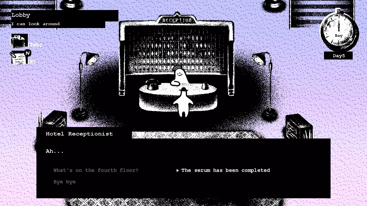 这是【重获人性】结局的攻略,该结局以成功研制出血清收尾。 第一天 在前台办理入住。