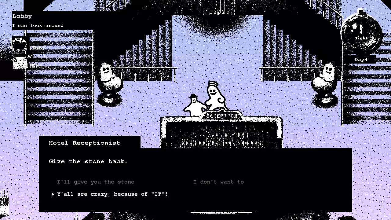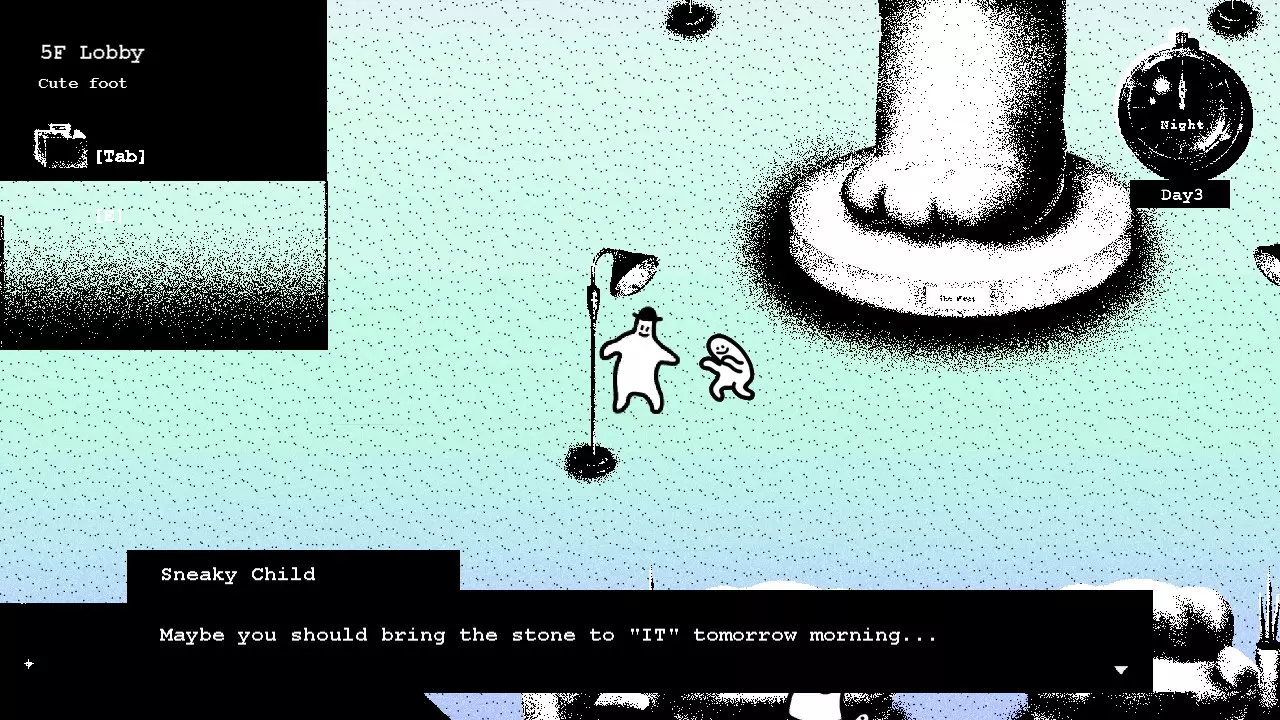 去五楼问问那个孩子是不是偷了你的石头,他会把石头还给你,并建议你去见“它”。现在你可以回自己的房间休息了。