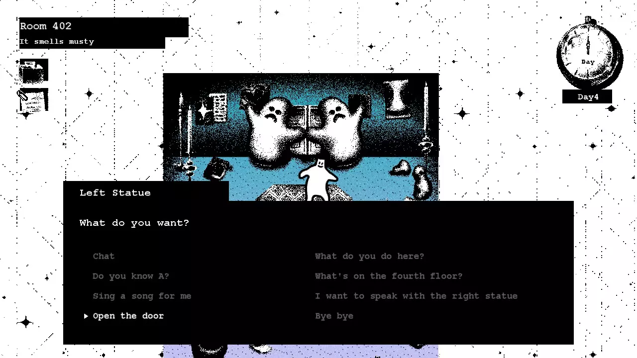 第四天 回到四楼并进入402房间。 与雕像对话并请求它打开门。回答【IT】、【时间的流逝】和【我几乎神志不清】。