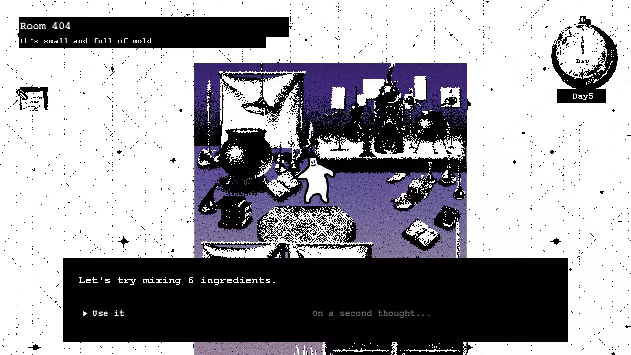 现在我们已经集齐了所有所需材料,可以前往404房间了。密码是A的信件末尾的日期。(这个日期也可以在一楼A的肖像上找到。我猜这封信对于推进剧情来说其实不是必需的。) -准备材料 使用研钵研磨石头和死蜘蛛(呃) 用混合坩埚将蜘蛛汁液和墨水混合(呃呃) 点燃坩埚,按风箱两次直到火焰变得“非常旺盛”,然后用它来熔化金币和糖果 -添加材料 1. 石粉 2. 蜘蛛汁液-墨水混合物 3. 肥皂粉 4. 熔化的黄金 5. 装满血液的注射器 6. 熔化的糖果