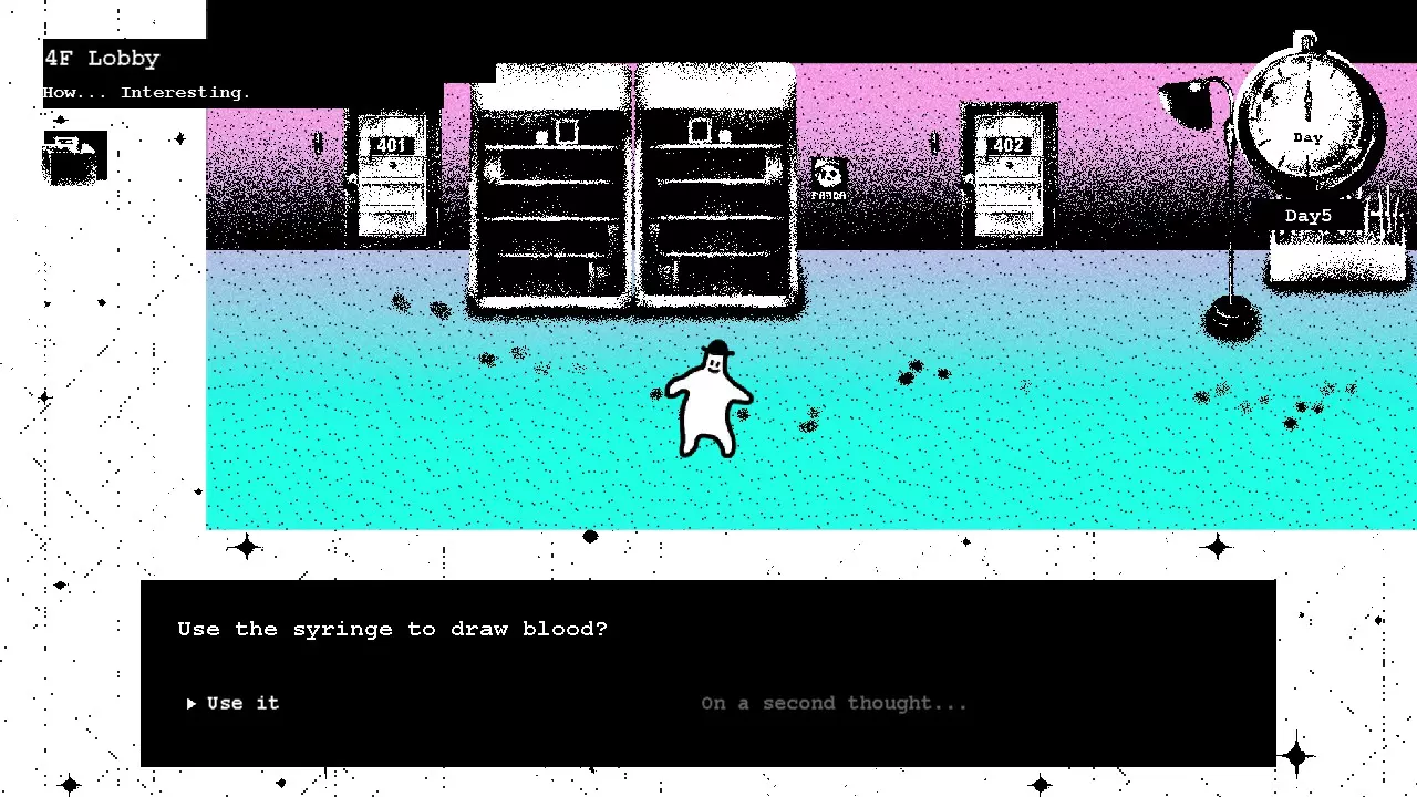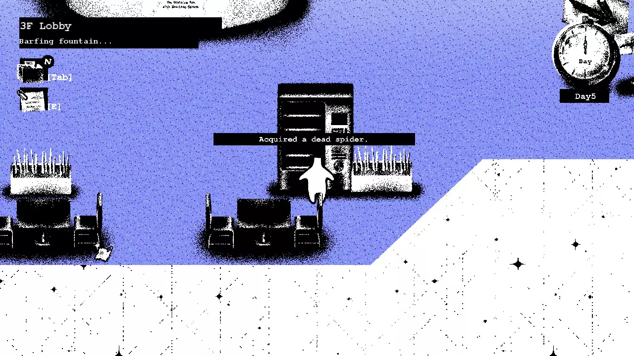 第五天 在前往A的房间之前,我们需要先收集血清的原料。 往自动售货机里投币,直到获得一只死蜘蛛(呃)。