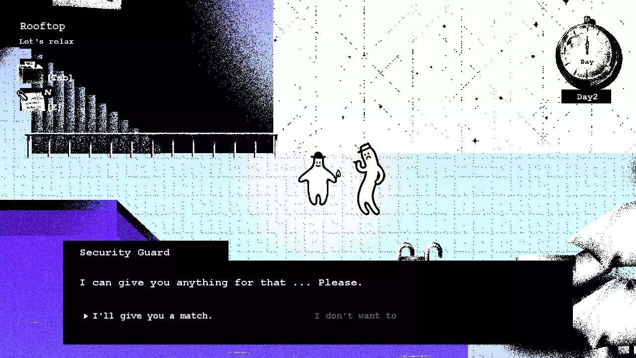 前往屋顶,在保安旁边点燃火柴(在物品栏中装备火柴)。与她分享火柴,她会给你地下室钥匙。