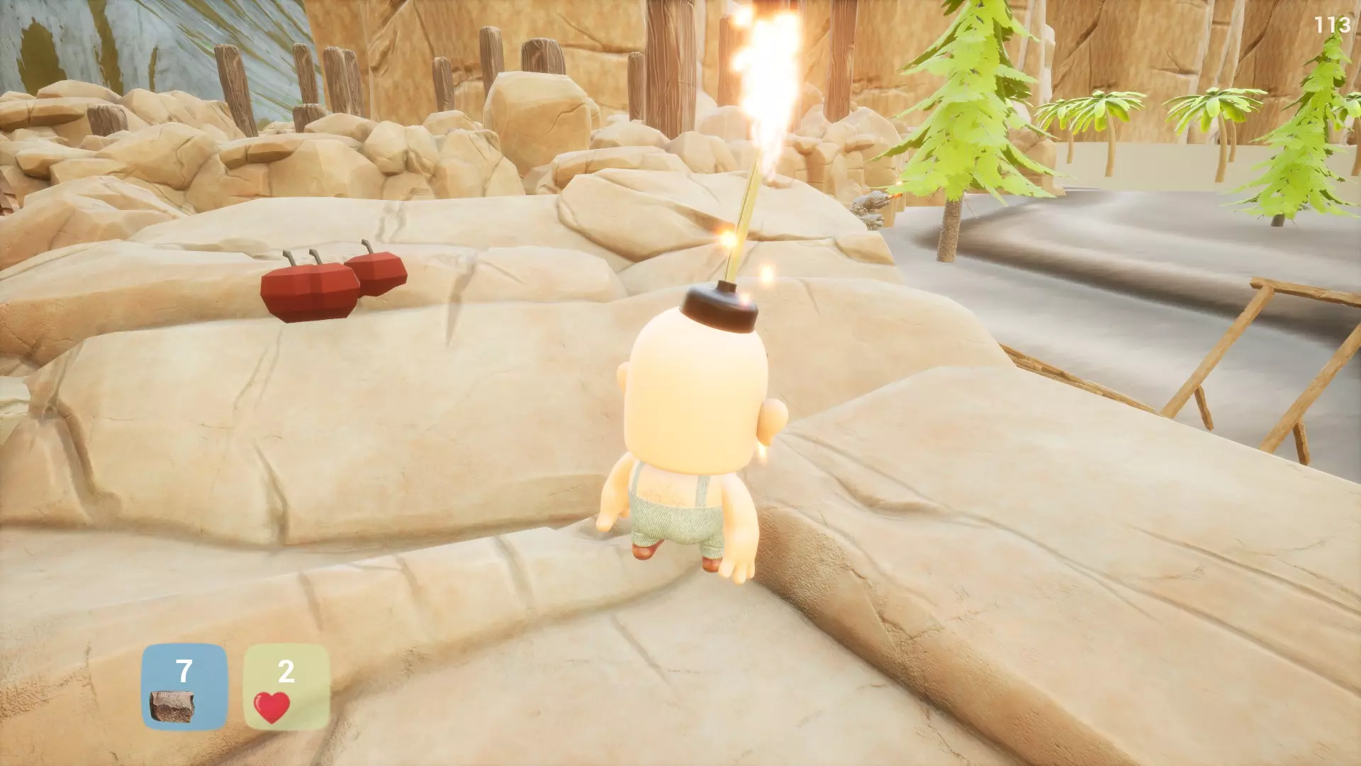 4. 前往岩石构造处,烧掉另一根绳子放下木板,找到苹果。