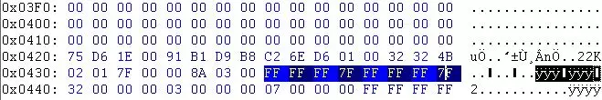 这是我们的存档存储经验值和金币数值的位置,每个数值占用4字节。这里有个注意事项,我们不能全部用FF填充。游戏会将4个FF字节识别为-1。更准确地说,金币和经验值是以有符号整数形式存储的,这意味着它们可能会变为负数。例如,如果我们尝试只修改1个字节,使其变为FEFFFFFF,那么在有符号整数中结果将是-2。至于上限,我们可以使用FFFFFF7F,这样经验值和金币的最大值就会是2147483647。