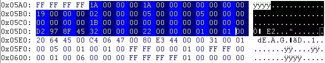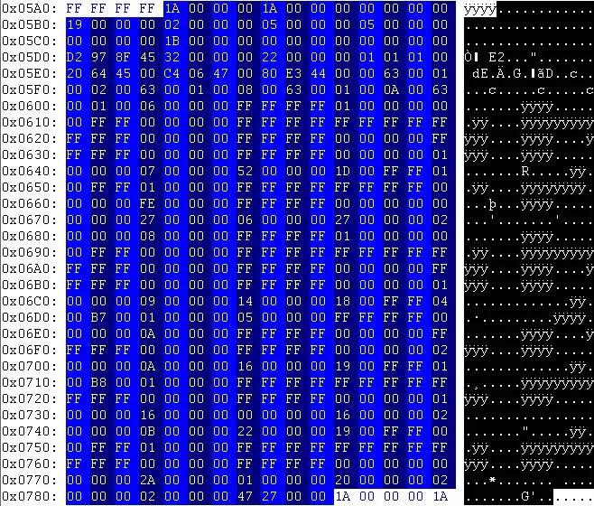 从领袖锁定的3个浮点值之后,我们可以找到技能。它们都是短整数,因此每个占用2字节。 00 00 = 近战 31 00 = 近战等级 01 00 = 是否启用? 05 00 = 侦察 01 00 = 侦察等级 01 00 = 是否启用? 依此类推。 使用通用字节列表中的技能列表,我们可以为这个乌鲁库巴尔(Urukubarr)进行如下设置:
