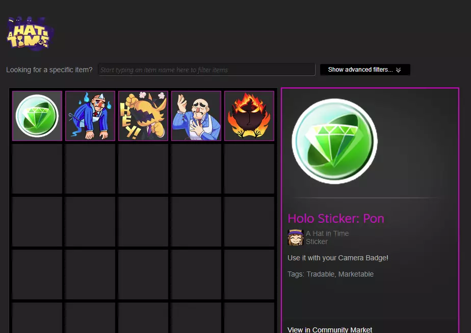 如图:飞船区域生成的全息版“瞌睡弓妹”贴纸,指南针徽章的箭头正指向它。 据我所知,除了“哇塞”贴纸、通过食物组合获得的贴纸以及初始自带的贴纸(猫咪犯罪、爱心和星星)外,所有贴纸都有全息版本。此外,不同的关卡区域似乎会生成特定的全息贴纸(黑手党小镇会生成黑手党和小胡子女孩贴纸,鸟之战役会生成列车长和DJ格鲁夫斯贴纸等)。 稀有贴纸也属于Steam库存物品,这意味着你可以与其他Steam用户交易贴纸,也可以在Steam社区市场上进行买卖。如果你在寻找特定的贴纸,又不想等待它刷新,或许可以去那里看看。