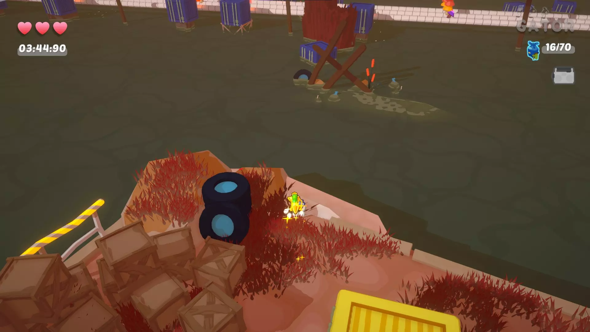 从这里开始,利用轮胎和蓝色 crate(板条箱)的顶部,直到你能跳到魔法青蛙上。