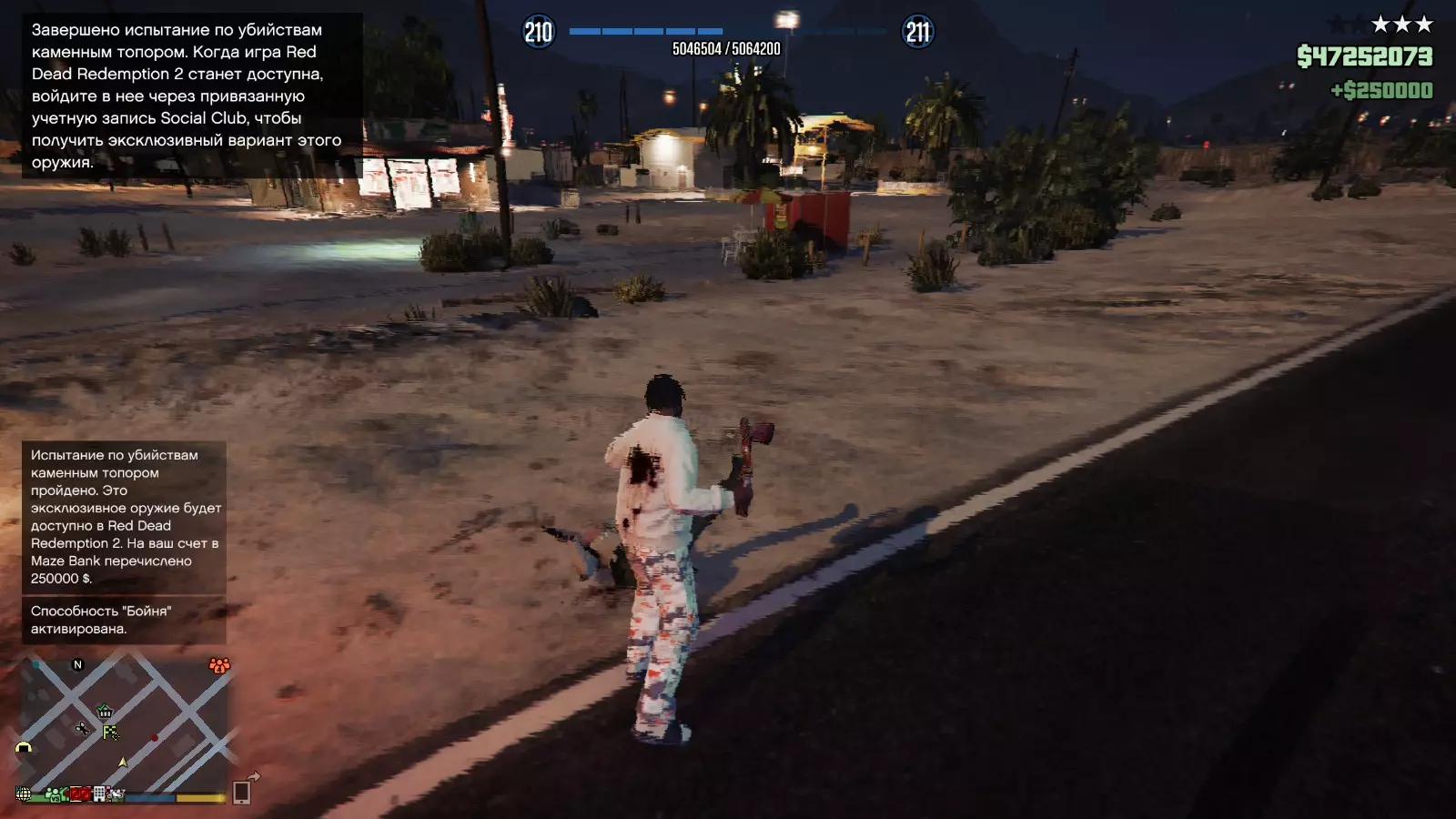 +250000美元 要获得250000美元游戏内货币,你需要使用这把斧头完成25次击杀。 完成后你将获得250000美元以及荒野大镖客2中的独家内容