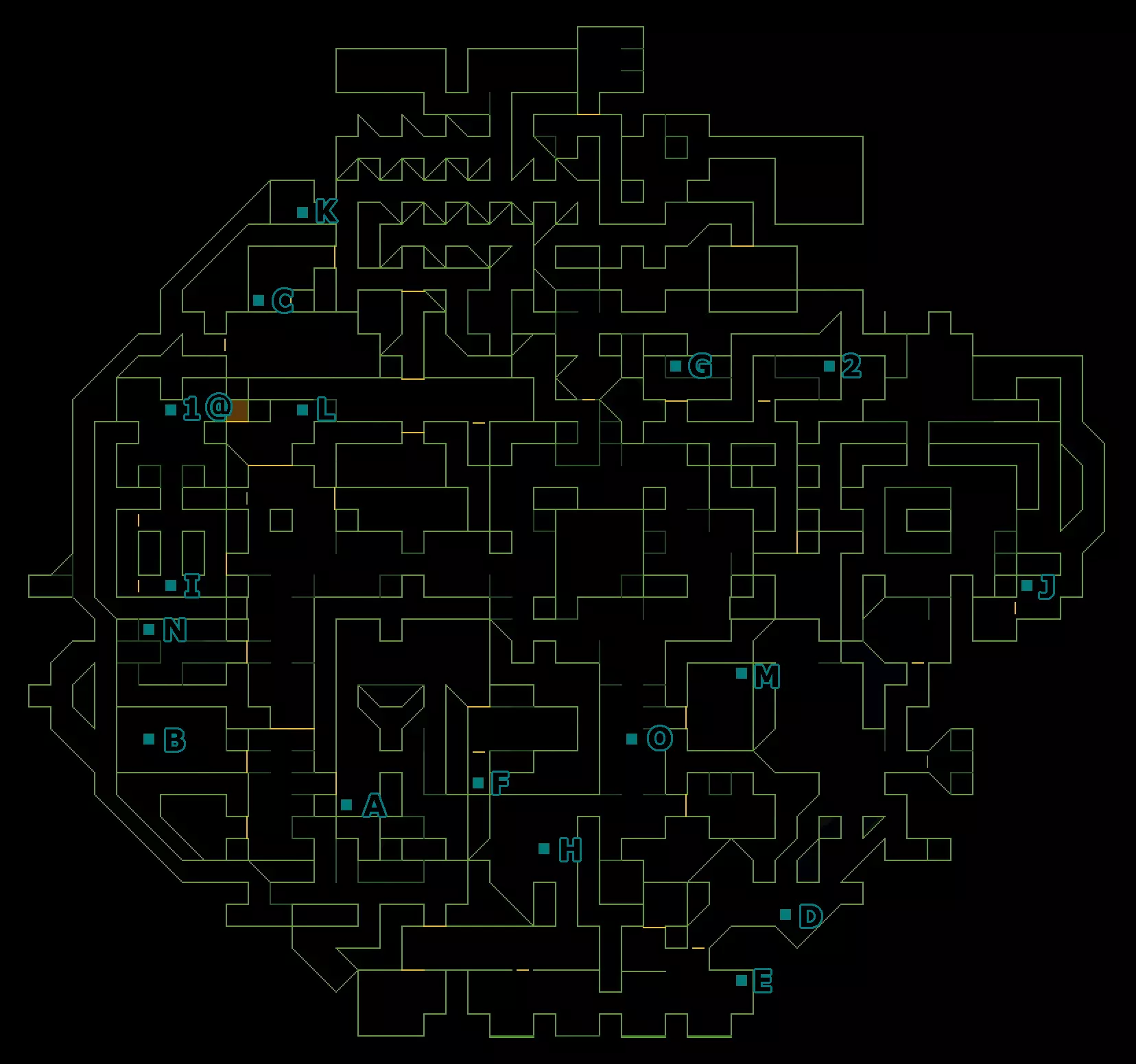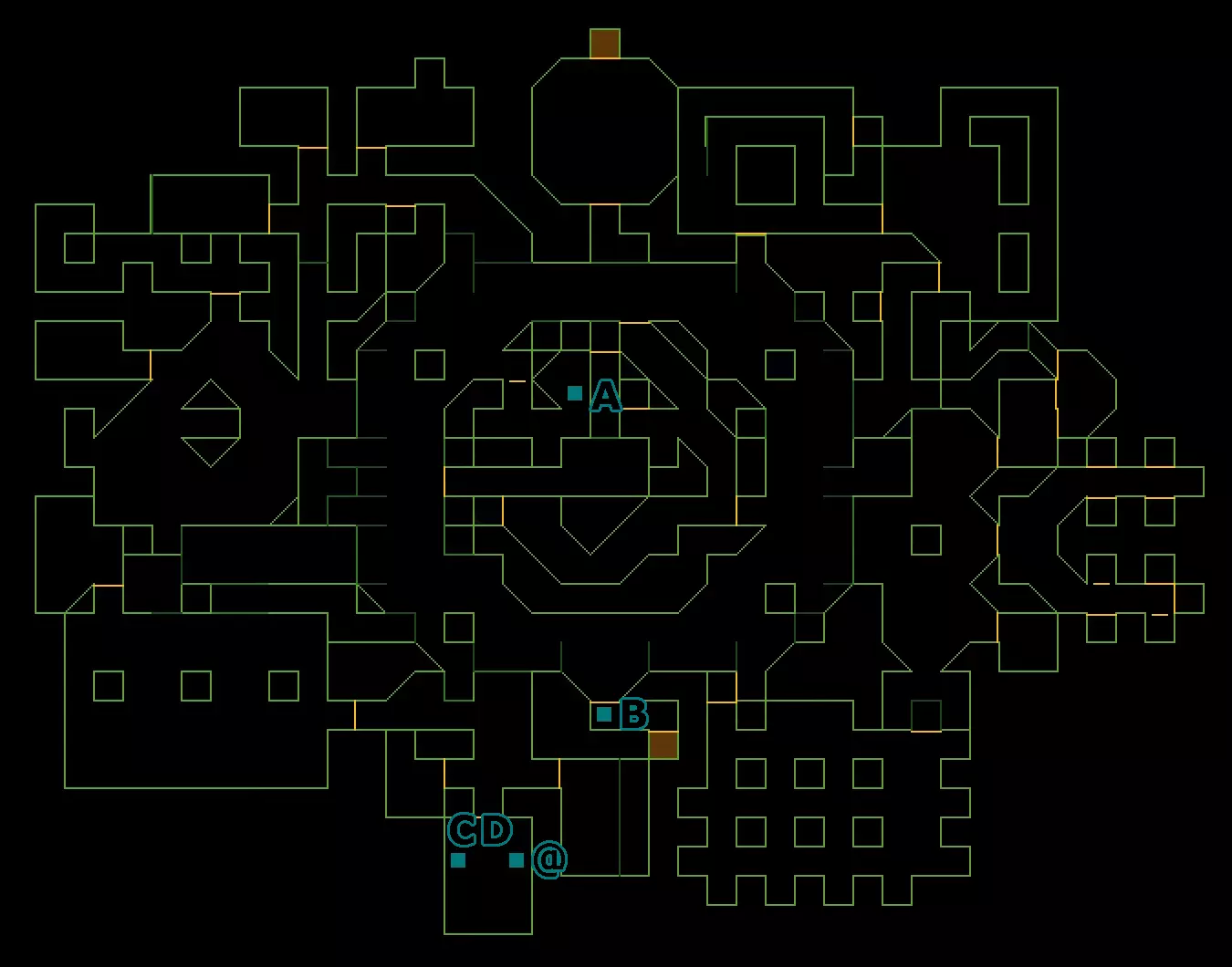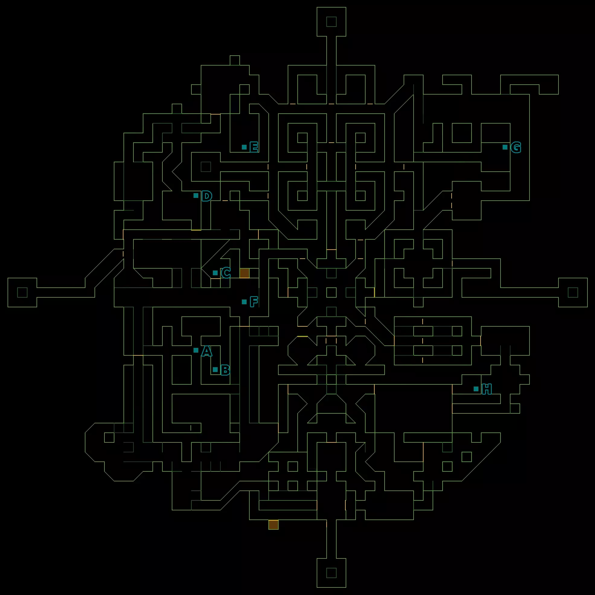 每张地图上都有蓝色方块标记兴趣点。这些方块右侧的字母按MDR中的显示顺序标明了音频日志的位置。部分地图上还有数字,用于显示纸质笔记的位置,这些数字没有特定顺序。如果赛博空间中有数据对象或数据碎片,其所在的终端会在地图上用【@】或【#】标记。 每张地图还会附带一个音频日志标题索引(与MDR中显示的一致),以便更轻松地查找特定日志,同时还会配有位置的文字描述。最后,赛博空间被划分为一系列线性排列的房间以及连接这些房间的数据流,数据流会自动推动你穿过它们,因此任何数据对象或碎片都会标注其所在的终端和房间编号。 R层 - 反应堆