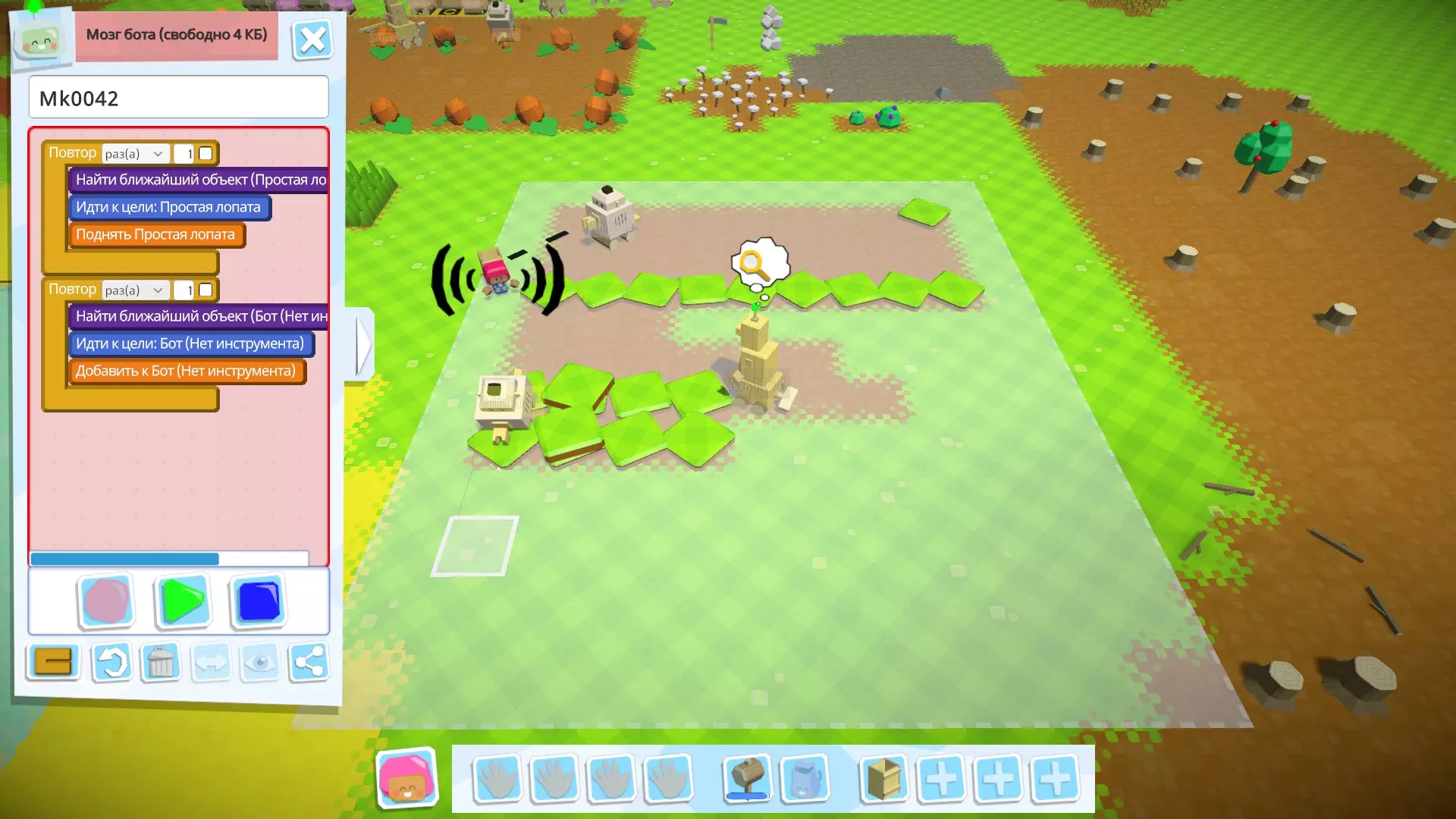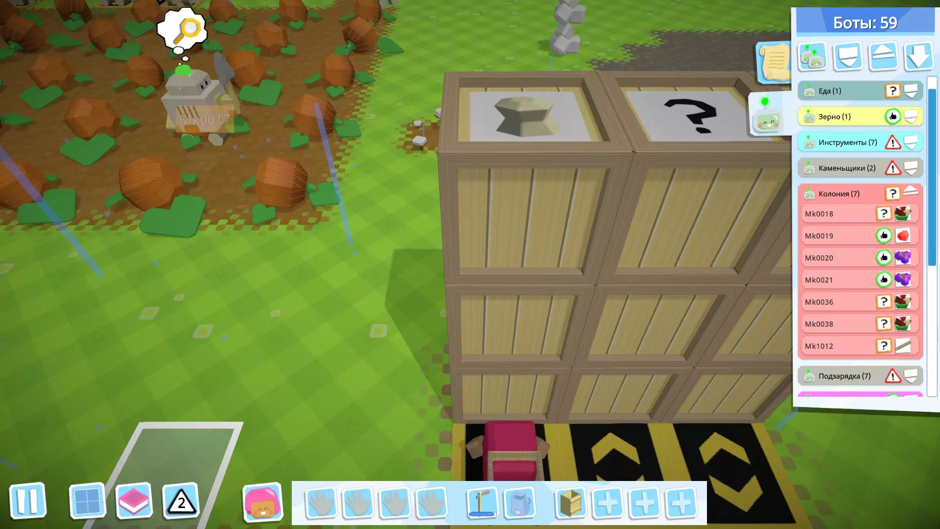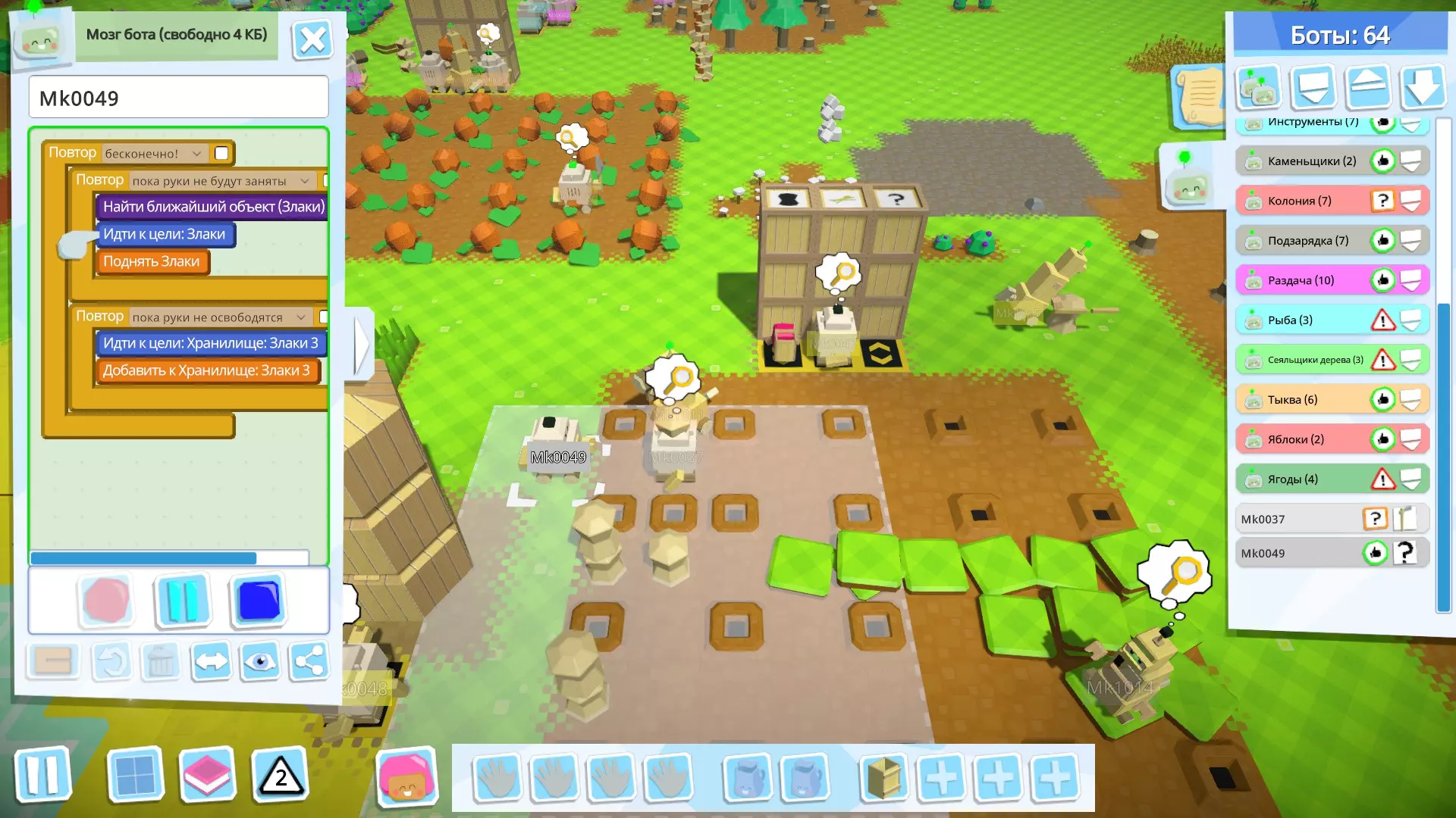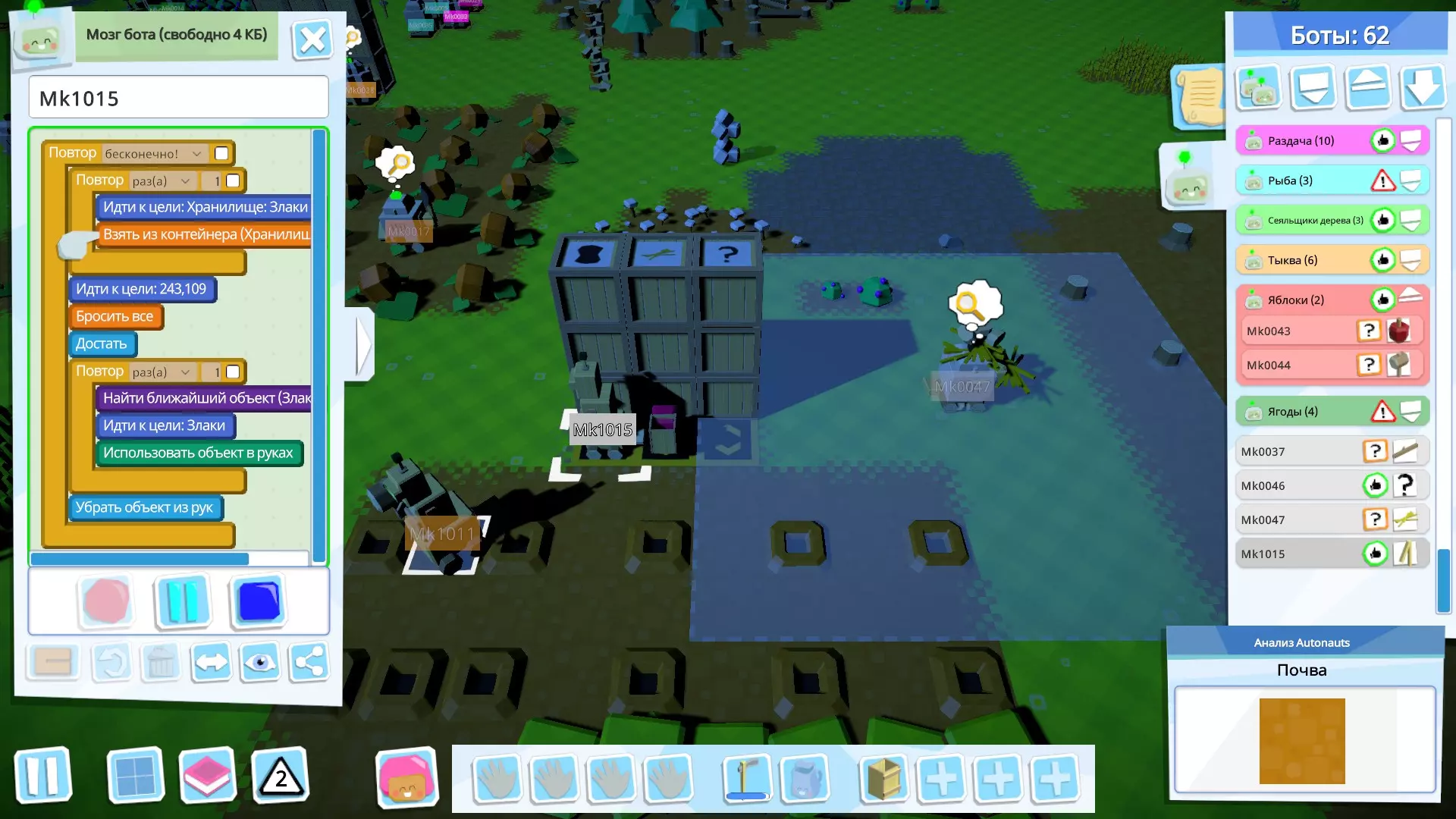 接下来,创建用于收集种子的机器人(如果方便的话,你可以为此创建多个机器人);它会从仓库中取出谷物和南瓜,搬到另一个地方并用工具(在我的例子中是简易斧头)进行处理。 如果你种植的是苹果——这部分你不需要,因为苹果、树木、浆果灌木、蘑菇都是直接种植的。