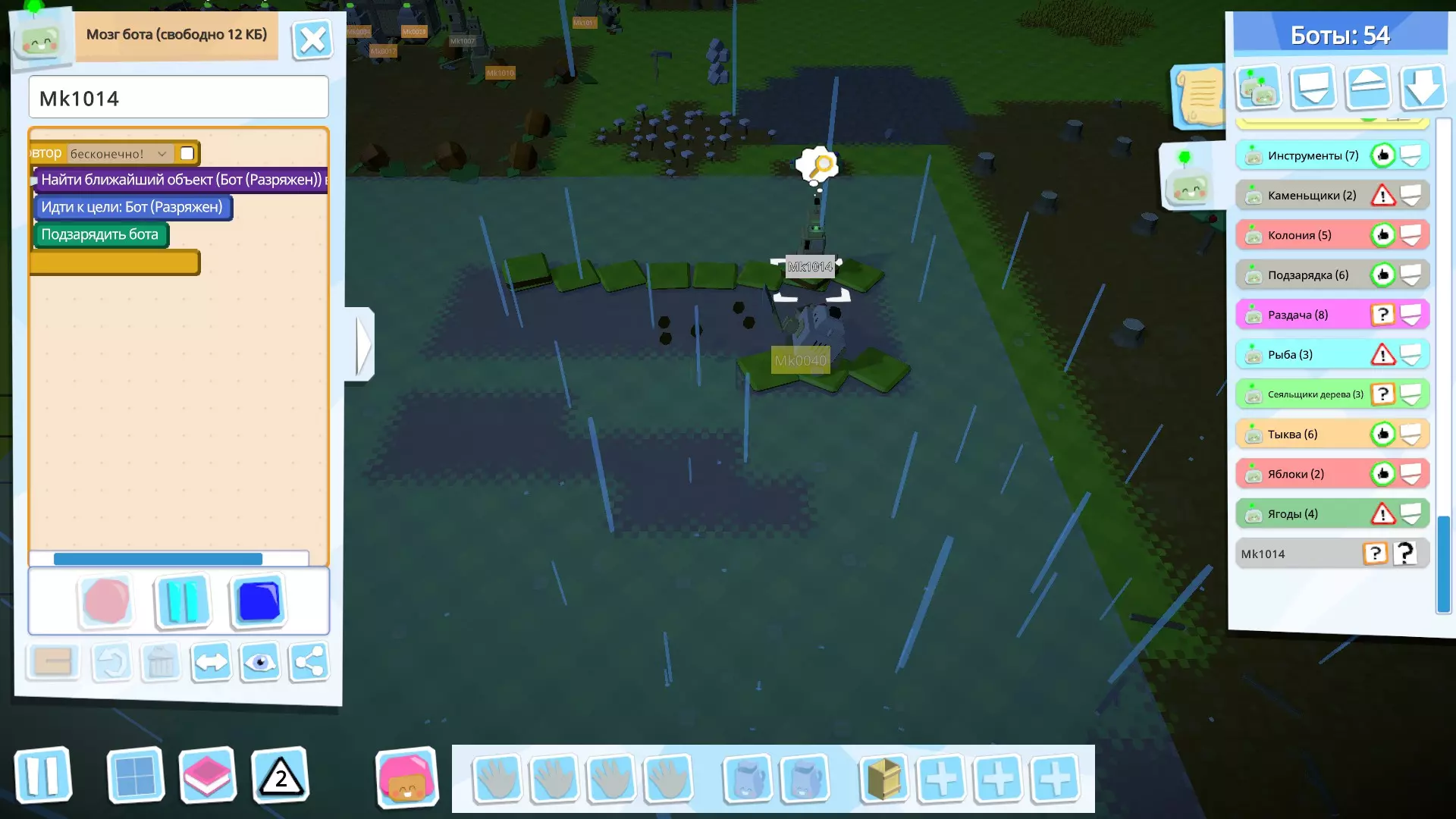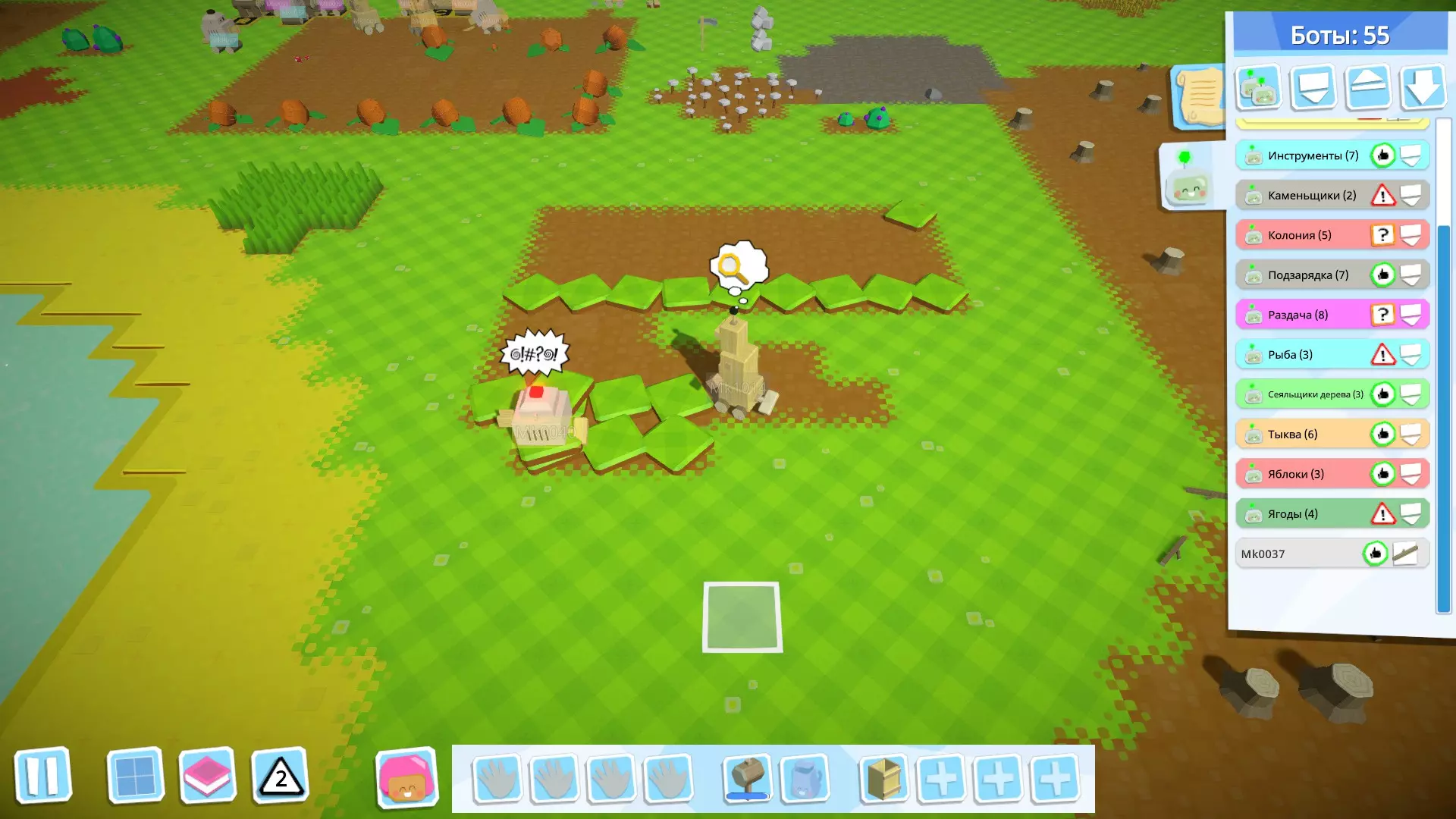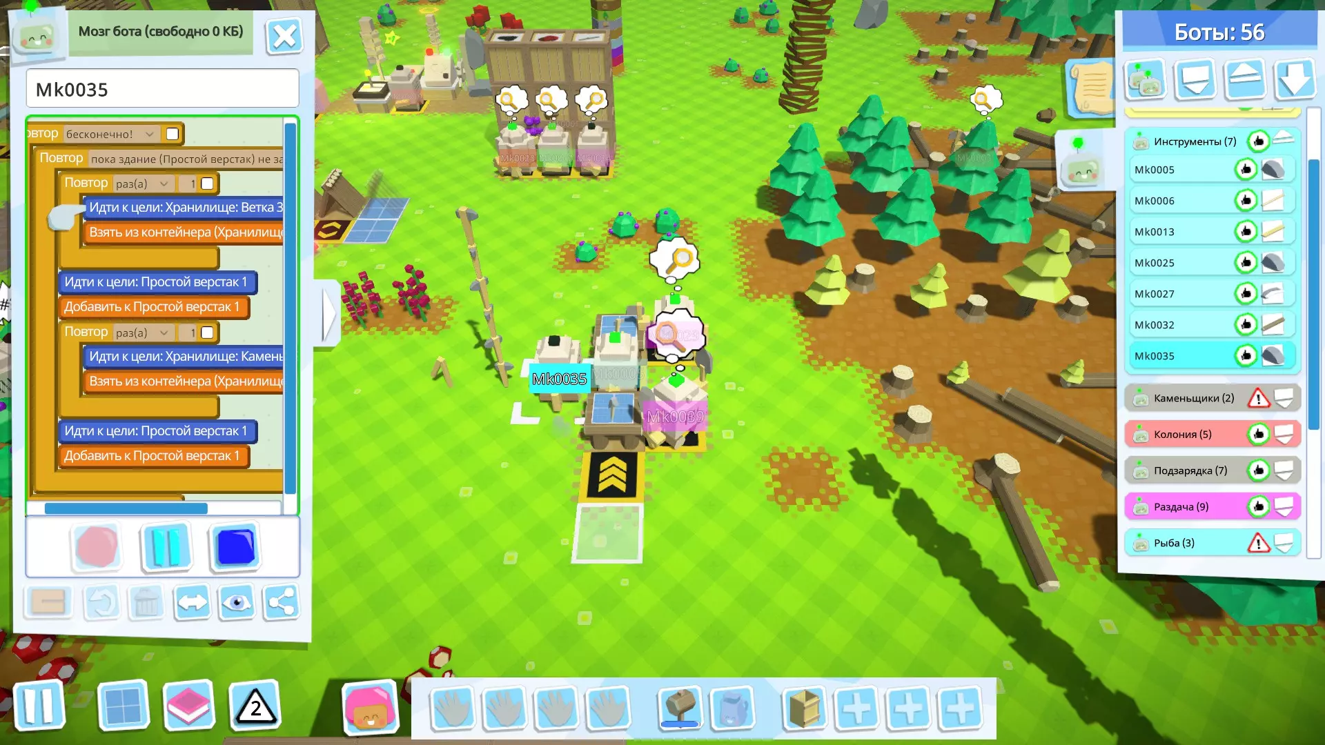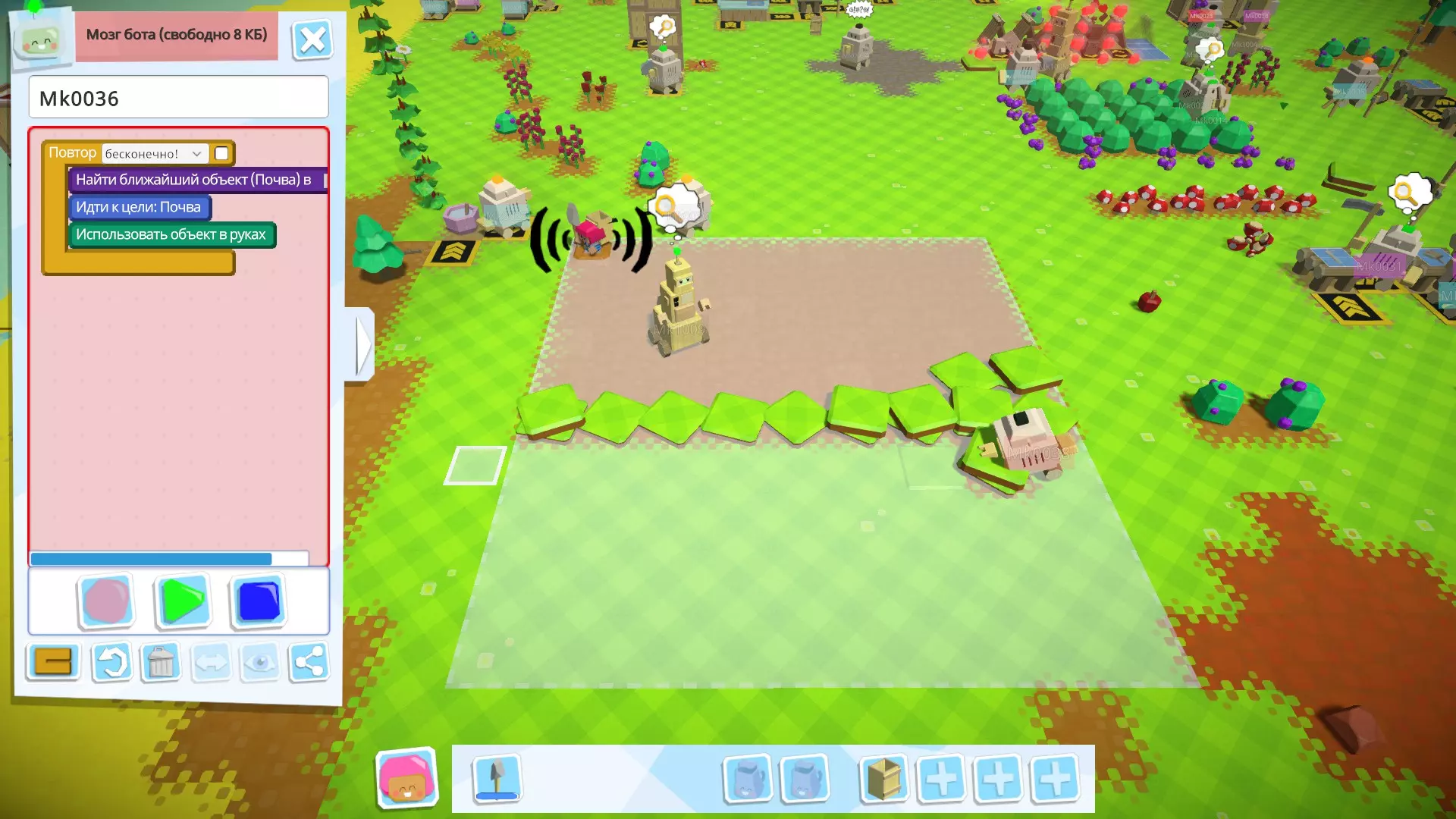 接下来,创建用于收集种子的机器人(如果方便的话,你可以为此创建多个机器人);它会从仓库中取出谷物和南瓜,搬到另一个地方并用工具(在我的例子中是简易斧头)进行处理。 如果你种植的是苹果——这部分你不需要,因为苹果、树木、浆果灌木、蘑菇都是直接种植的。